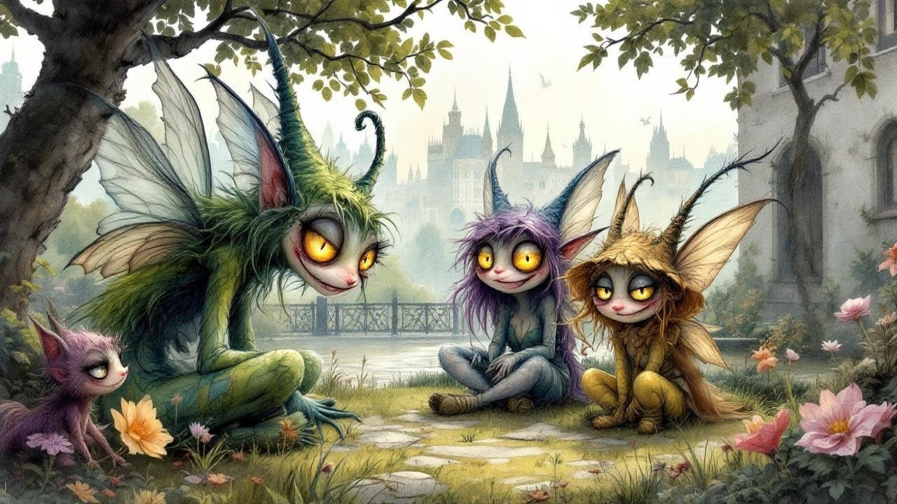 Prompt: Create an image, rendered with deep chiaroscuro and rich, textured brushwork. Depict a peculiar middle-aged gnome seated at a heavy wooden table, dimly lit by the trembling glow of candlelight. His pointed hat is faded and torn, its edges frayed with age. A wild, tangled beard frames his face, which bears a curious expression. One eye mischievously askew, the other glinting in the low light, and his mouth stretched into a broad, unsettling grin revealing sharp, uneven teeth.