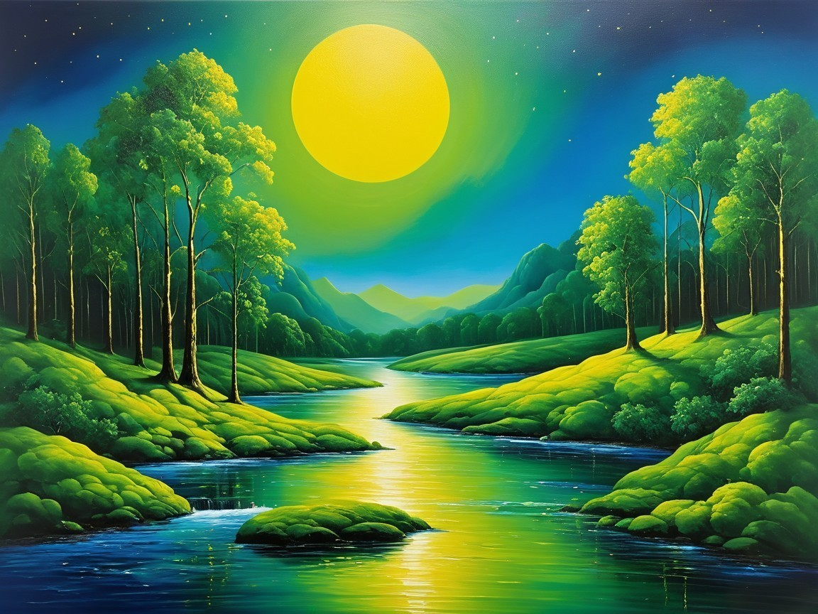 Prompt: iridescent leaves and roses with a fluffy grey Fox sitting beside a beautiful moon lit stream at night, the water is glowing moon light and there is a beautiful owl in a tree