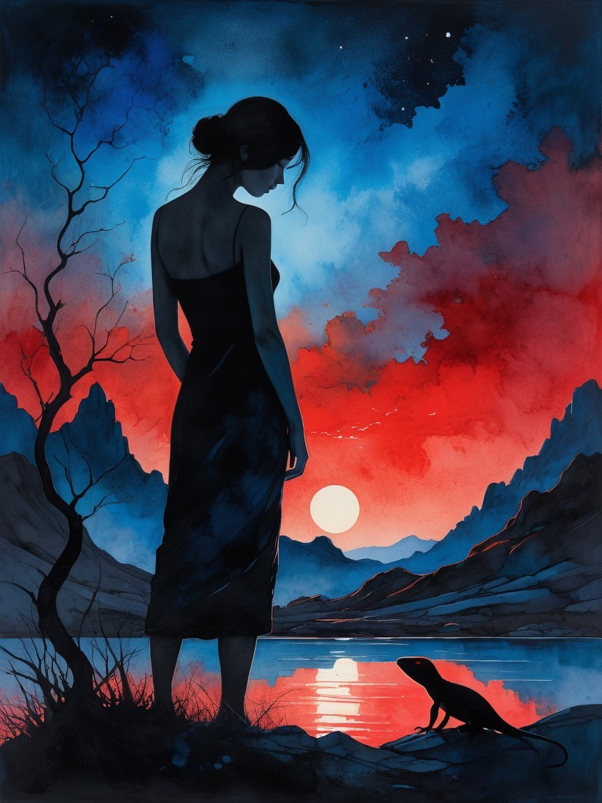 Prompt: EmmAI Fragile Vision style, a melancholic dream of solitude. A delicate girl with flowing raven-black hair sits perched on a windowsill, gazing out at a city submerged in deep sapphire and midnight blue hues. Beside her, a porcelain cup creates a swirl of steam. In the background, a fireplace flickers with a soft, fragile warmth, contrasting the cold blue exterior. Hazy breeze, ethereal watercolor and ink texture, soft focus, dreamy atmosphere, double exposure, intricate details, emotional and fragile.