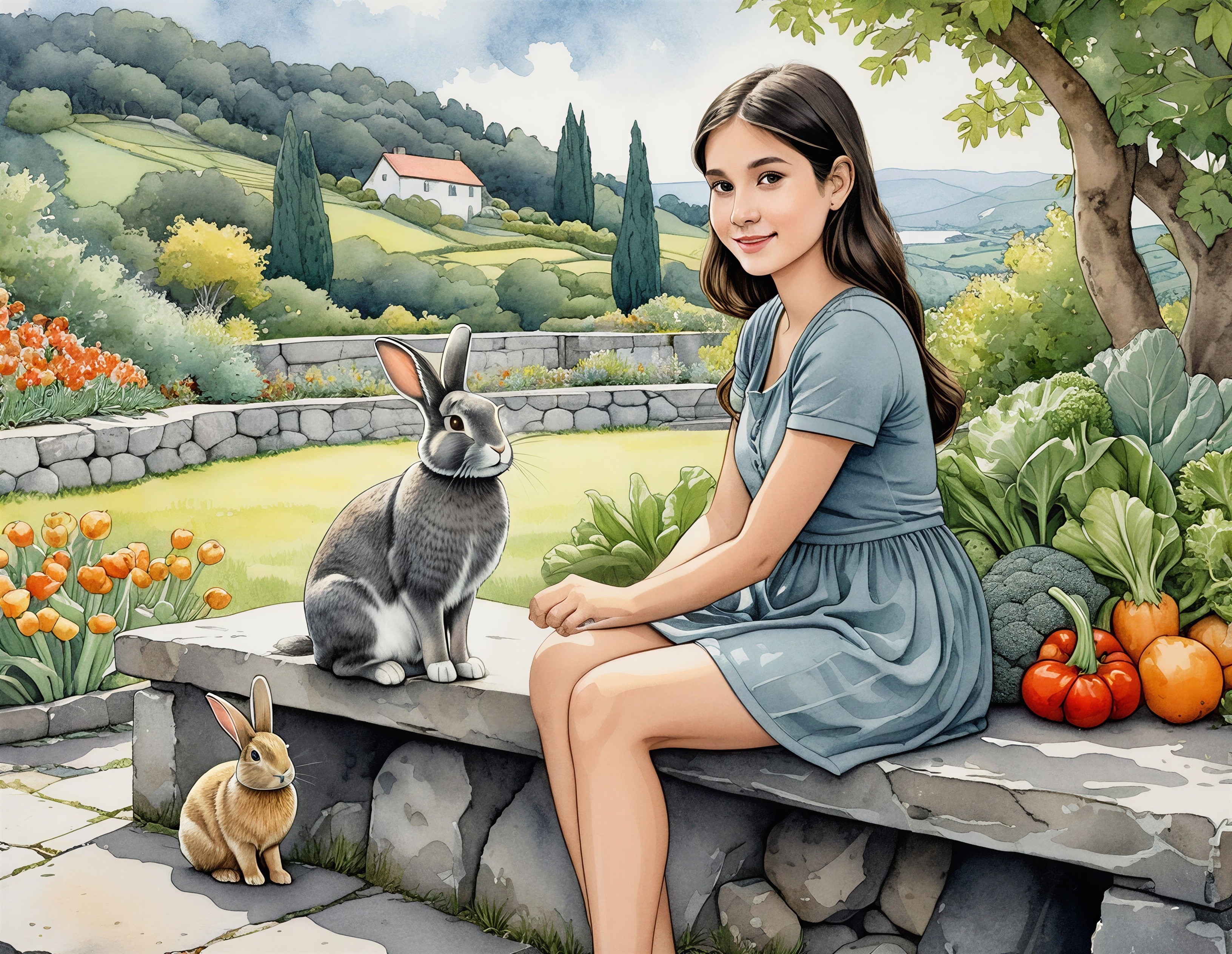 Prompt: Gouache and pastel, woman with hair folded into a knitted winter beret. She wears a plush down jacket and a robin-blue wrap scarf, her glance shimmering in the same soft tone. Snow falls as speckled ink mist across muted watercolor hedges and distant rooftops. Feathered dry-brush textures, matte pastel dust. Velvet-toned glazing with diffuse pastel bloom.