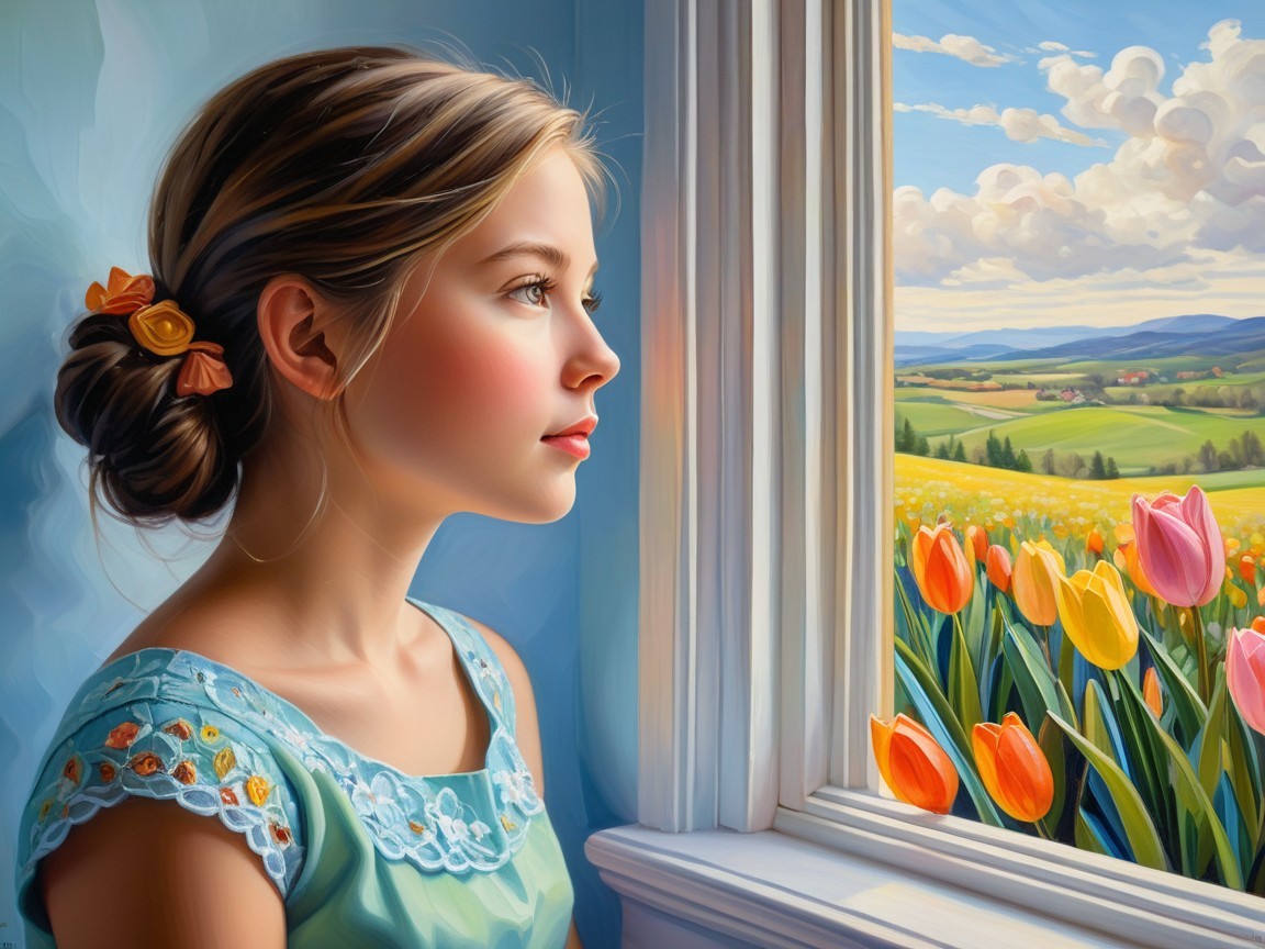 Prompt: This emotionally charged oil painting captures a red-haired female figure with a dog at her side on the edge of a world of striking contrasts—bathed in golden light and swallowed by profound darkness. With expressive, dense brushstrokes, the artist shapes the woman's contemplative posture as she observes a vast, abstract yellow field. The dramatic division between the luminous foreground and the obsidian-black sky behind her evokes themes of isolation, memory, and longing. The figure, depicted in soft shades of gray, copper, and cobalt blue, radiates a quiet strength and introspection, offering an engaging visual narrative about presence and absence, hope and uncertainty.