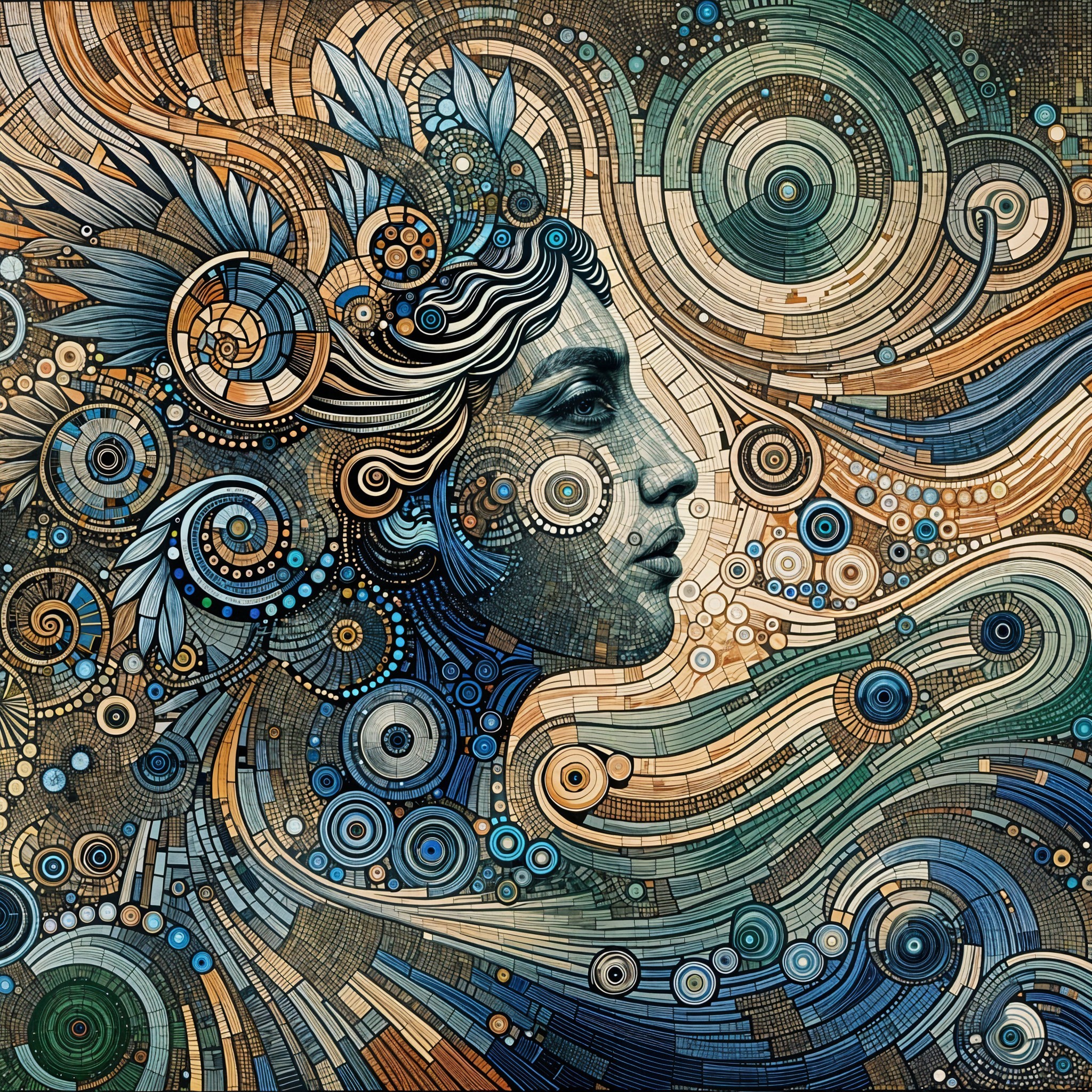 Prompt: ((A colorful panoramic masterpiece)), ((A breathtaking stylized portrait of a woman with flowing, silky long black hair that cascades like liquid midnight. Her striking makeup glows with dramatic contrasts — shimmering metallic eyeshadow, bold eyeliner, and deep crimson lips — evoking both elegance and intensity. The background explodes into a kaleidoscope of vibrant geometric forms, layered with intricate fractal-like patterns and radiant neon hues. Shapes interlock like stained glass, pulsing with bold colors — sapphire blues, fiery oranges, emerald greens, and luminous magentas — creating a sense of rhythm and energy. The composition balances modern digital artistry with echoes of Art Deco and Futurism, making the portrait feel timeless yet avant-garde. Every detail — from the subtle highlights in her hair to the precision of the geometric tapestry — contributes to a stunning, gallery-worthy masterpiece that radiates power, beauty, and sophistication), In patchwork-style of Mamoru Nagano, Masamune Shirow, Joan Miró and Tomasz Setowski. (Full Size, Full Length and Full Scale Image).