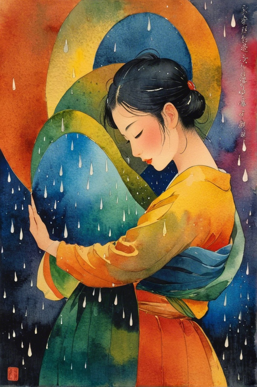 Prompt: Paint a dreamy hazy breezy wet on wet watercolour artwork, using minimal paints and maximum loose water effects, EmmAI autumnal colour palette, melancholy composition, minimalist, impressionist, with no text, no artifacts. A dreamy and ethereal scene featuring a side profile of a beautiful East Asian woman with long, flowing hair and a delicate veil. She gazes serenely at a large, glowing full moon reflected on a tranquil sea at twilight, surrounded by a starry night sky. In the background, faint silhouettes of distant forest create a mystical atmosphere, blending soft purples, blues, and hints of silver in the sky and water, evoking a sense of calm and wonder.