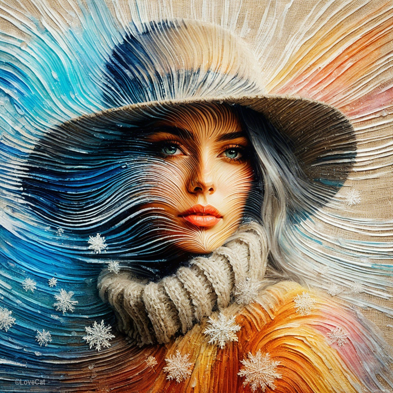 Prompt: A masterpiece of abstract fragmentary cubism with elements of surrealism. A surrealistically beautiful sunset among snow-covered winter mountains. An unusual heavenly glow reveals the vague, mysterious silhouettes of tall, thin people. A complex interplay of colors. Color sublimation.