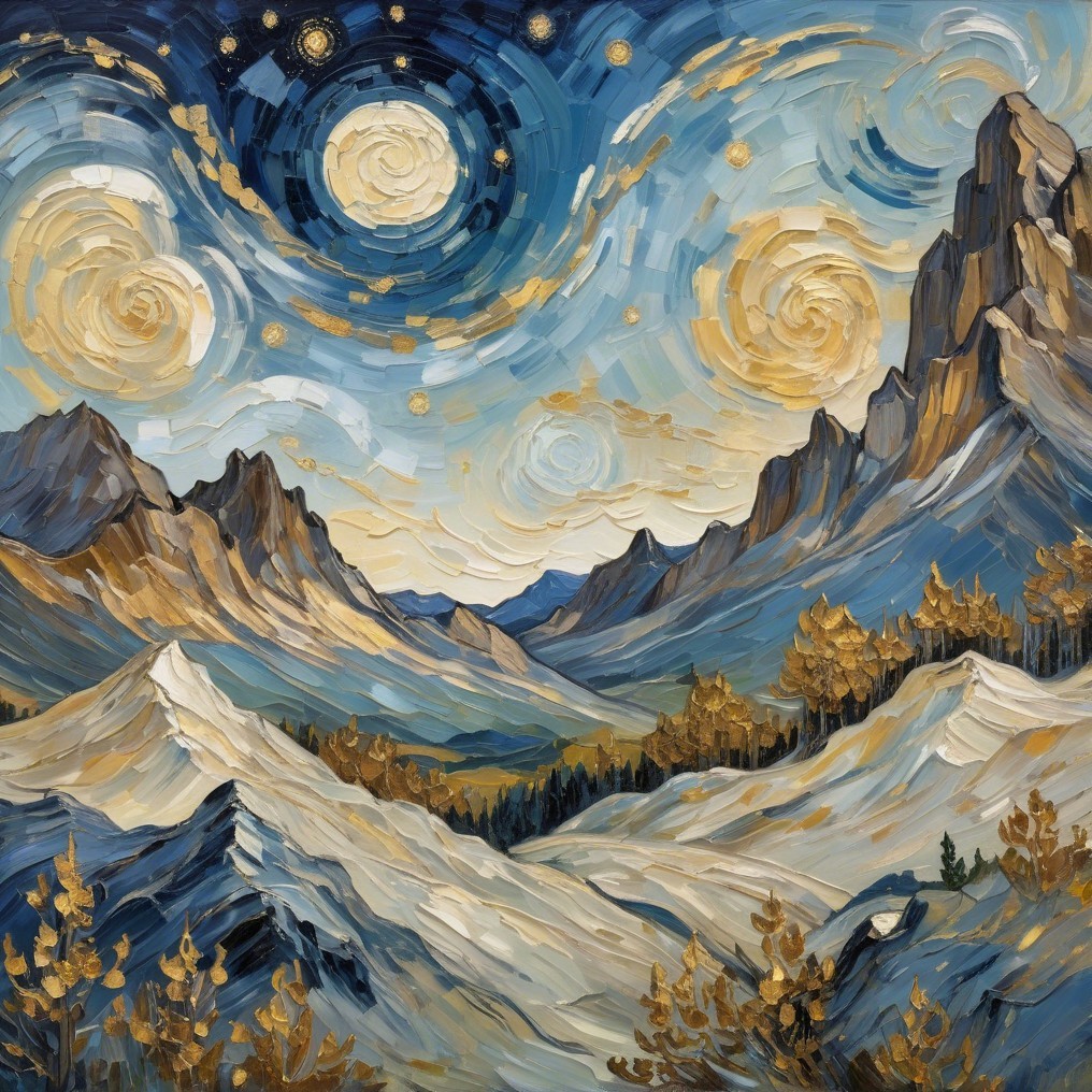 Prompt: Grunge textured abstract impasto mixed media painting with dripping paint, fantastical otherworldly frozen winterscape with iridescent metallic colors, silver lines, by Andy Kehoe, Klimt, Joan Miro,Ton Dubbeldam, John Hoyland, Amanda Clarke. Reflective frozen pond, surrounded by whimsical, filigree, impressive frosted leaves standing tall on long stems; tendrils, grasses, cattails. Dramatic sky with stormy clouds. with mercury glass patina, glowing golden sparks, vibrant iridescent colours, psychosomatic surrealism, by Susanne.