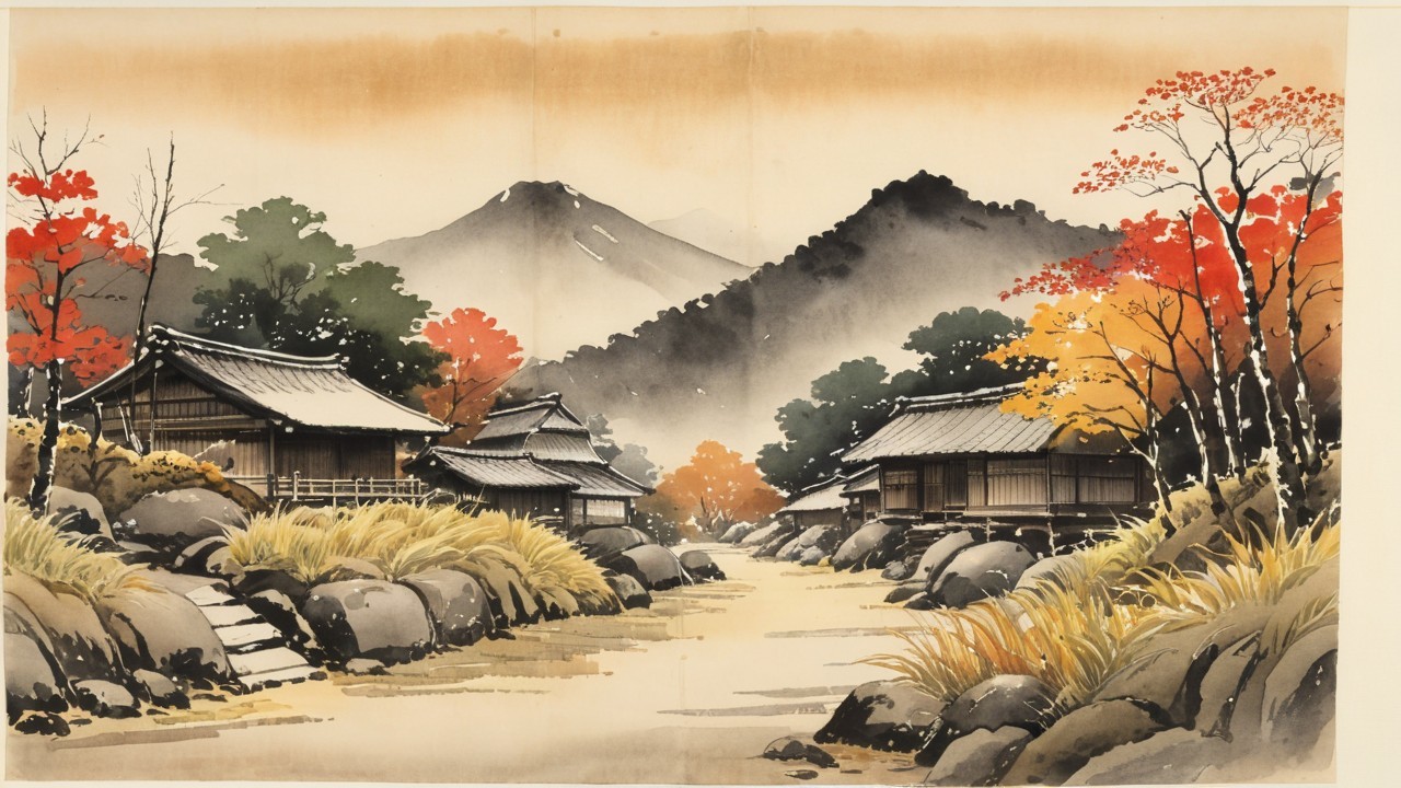 Prompt: A stunning landscape featuring vibrant green meadows, towering mountains, and a winding river. Quaint cottages dot the scene, set against a backdrop of blue skies and fluffy clouds, creating a serene atmosphere.