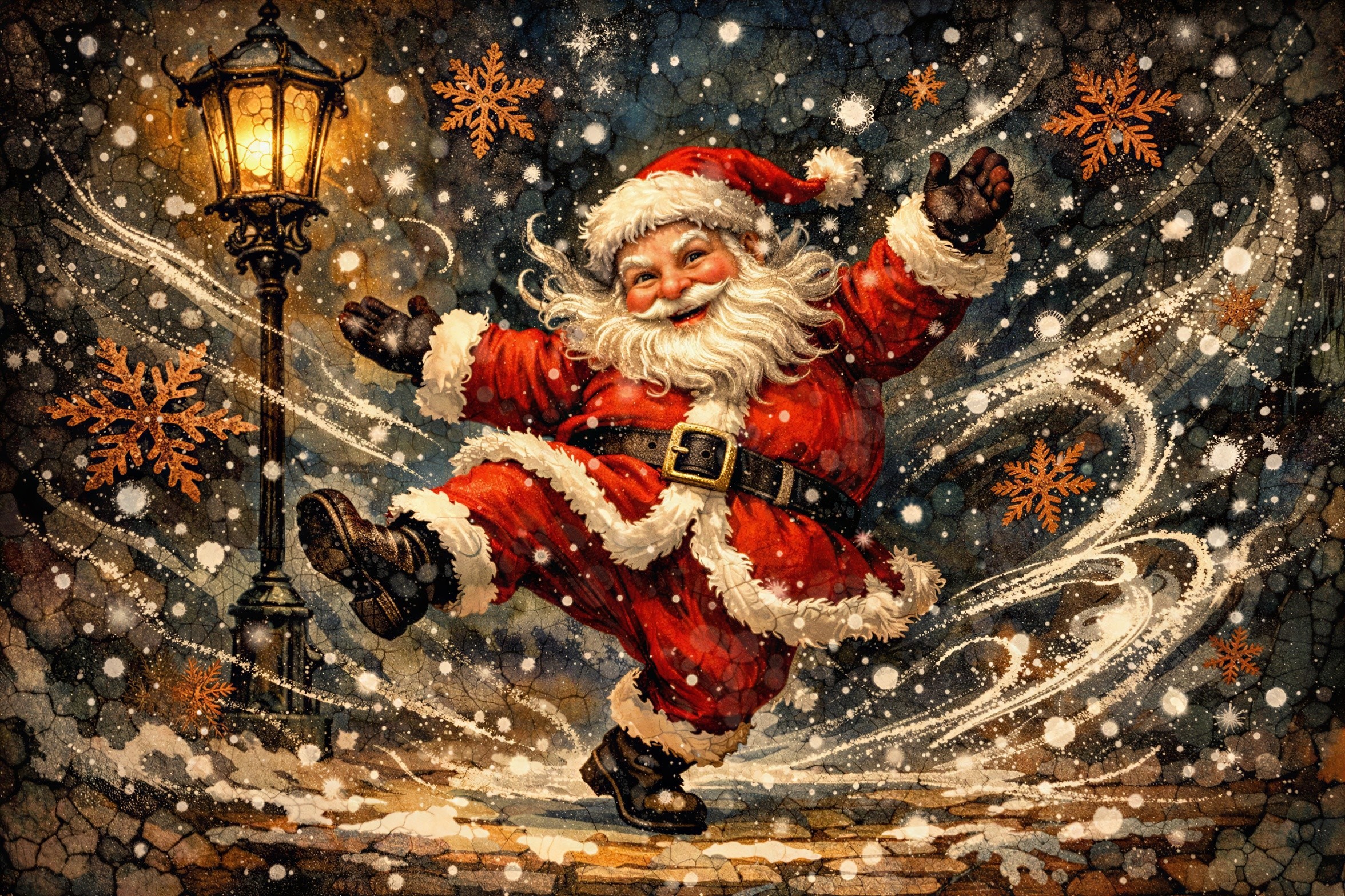 Prompt: oil painting style, thick brushstrokes, Van Gogh star-like swirls A whimsical and ethereal digital painting of a young boy in vintage Victorian attire, wearing a newsboy cap and a heavy woolen coat, playing a large rustic wooden field drum. The scene is set on a cobblestone street at night during a magical snowstorm. The atmosphere is filled with swirling golden embers and soft snowflakes. Warm, glowing light from a nearby gas streetlamp and decorated trees creates a cinematic bokeh effect. Hyper-detailed textures on the wood and fabric, nostalgic sepia and gold color palette, magical realism, 8k resolution, intricate details, masterpiece.