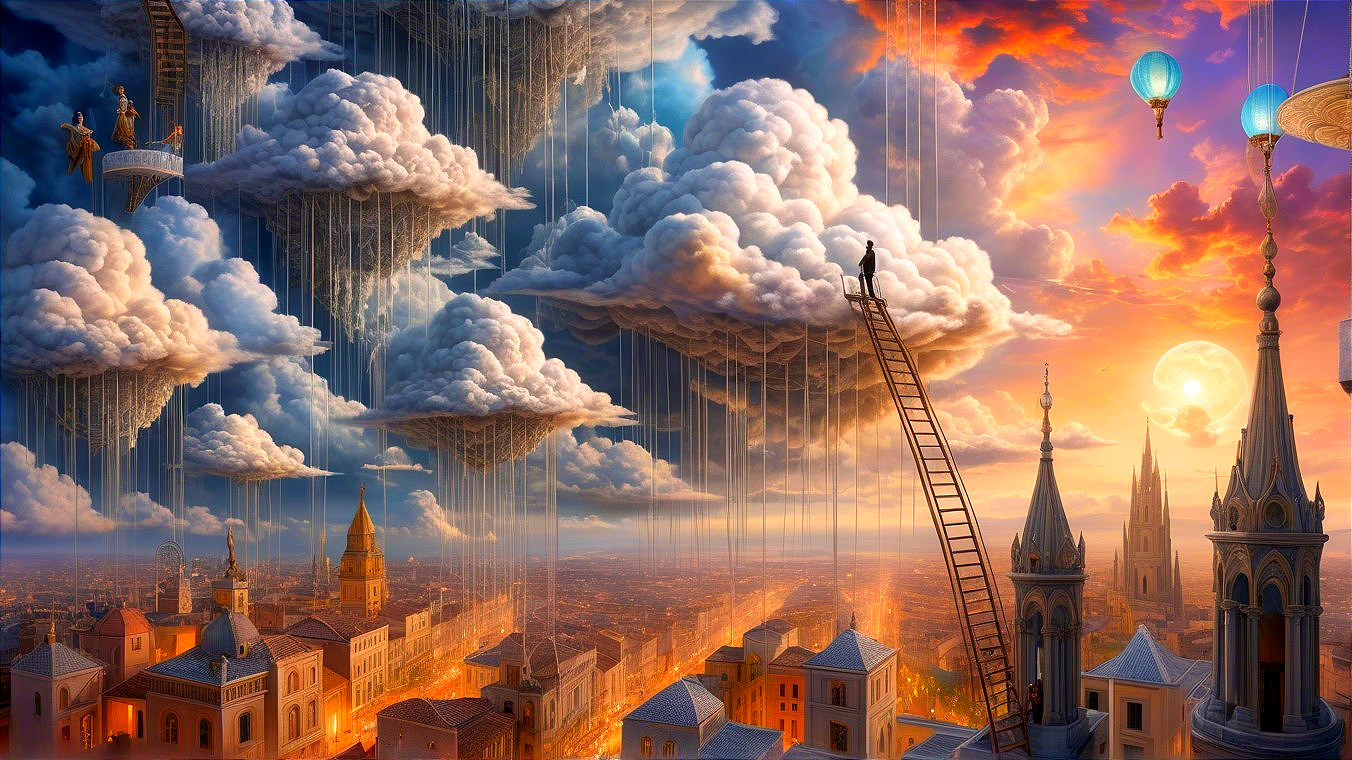 Prompt: A surreal, dreamlike artwork in style of Scott Bergey, Richard Burlet and Igor Morski: "Vibrant surrealist masterpiece, elegant female silhouette, pearl string gown, white wired hair, surreal clouds, iridescent colors, impasto line art, golden glitter details."
