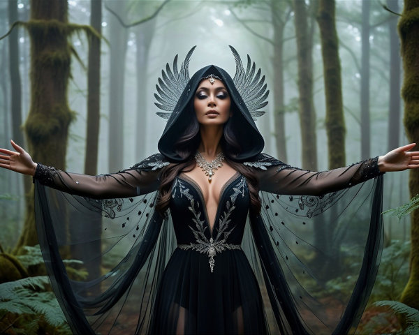Prompt: A graceful ethereal woman in a flowing golden-silver gown stands on a small wooden boat drifting on a still forest lake. She is placed gently in the foreground, closer than before but not overwhelming the frame — the viewer sees her clearly while the serene landscape remains fully visible around her. She looks directly at the viewer with calm, mysterious eyes. Soft sunlight highlights her dress, while misty trees, blooming flowers, and water lilies create a dreamy, fairytale ambience in the background. Mood is poetic, mystical, melancholic, and cinematic. Style: Yoshitaka Amano × Donato Giancola × Alan Lee.