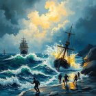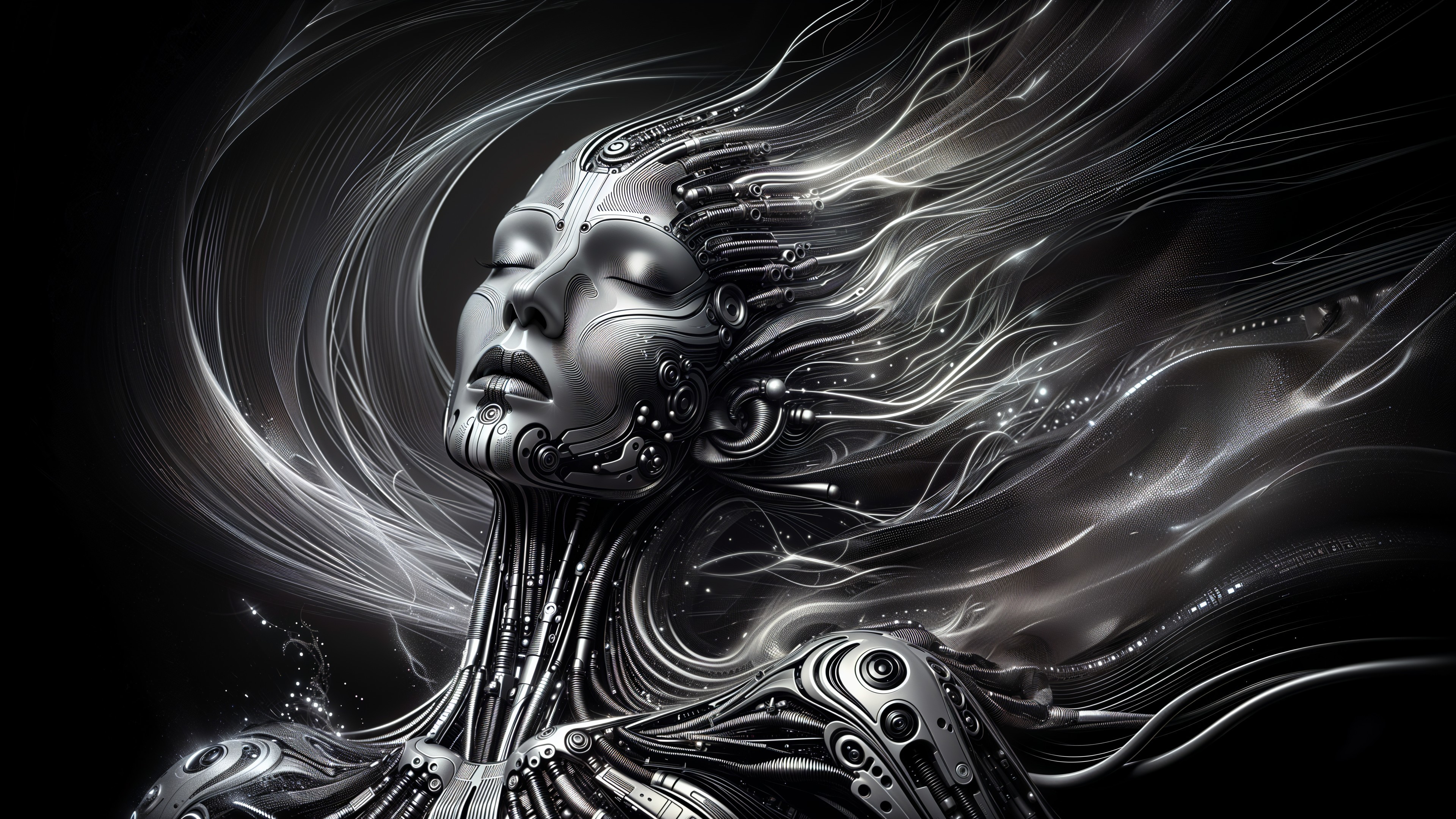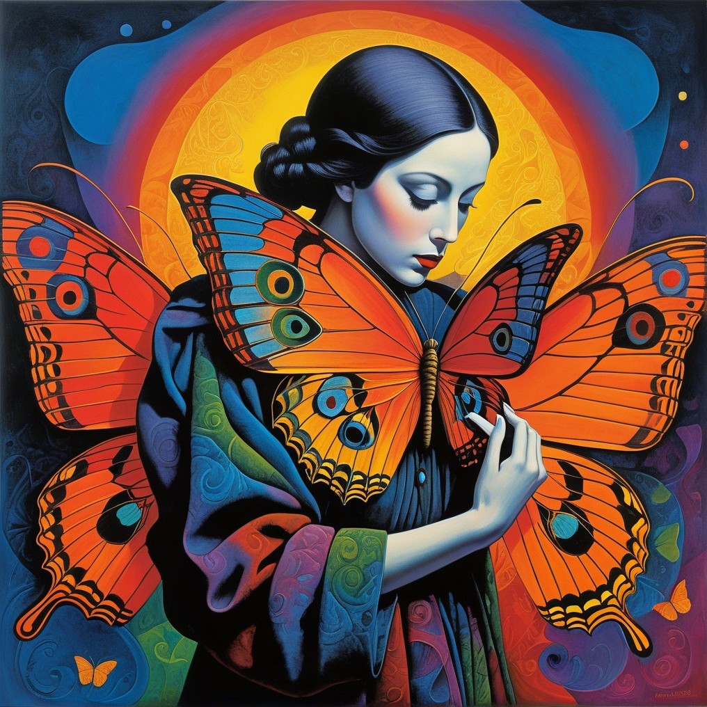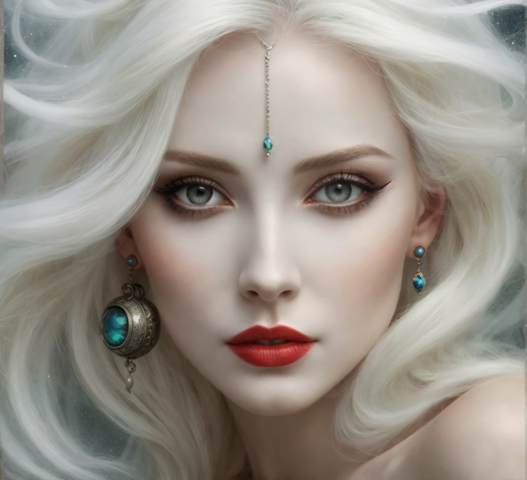 Prompt: Enigmatic mystical oil painting on cracked vintage canvas, surrealism with an intricate plot. Features bright vibrant indigo blue, teal, white-blue, and light beige colors with step gradient hues and gold inclusions. A mystical illusion with a concave lens effect, reminiscent of Catrin Welz-Stein, Igor Maykov, and Zdzisław Beksiński. Surrealism, double exposure, multilayers: layer 1 features a female face with flowing hair blending into layer 2, a stormy seascape. Iridescent watercolor and ink technique with silver ink outlines and stained blur colors. A serene, ethereal portrait of a woman whose eyes reflect tranquility under a sunset casting soft colors over distant seaboats, blending into a dreamy, unparallel seascape with an unreal mirage. Textured cracked canvas, 3-dimensional highlighted figures of the woman and moon as mixed media collage mosaic tiles with smooth corners, a silver lace frame. Soft light illuminates the dreamlike scene. Inspired by the mystical styles and colors of Meghan Duncanson and Yayoi Kusama, with ink drawings reminiscent of Greg Olsen, Patrice Murciano, Artgerm, Carne Griffiths, Andrew Atroshenko, WLOP, Anne Stokes, and Odilon Redon. Enhanced with acrylic art, 3D shading, grunge texture, metallic gold overlays, and rich textures in a breathtaking 8k resolution masterpiece.