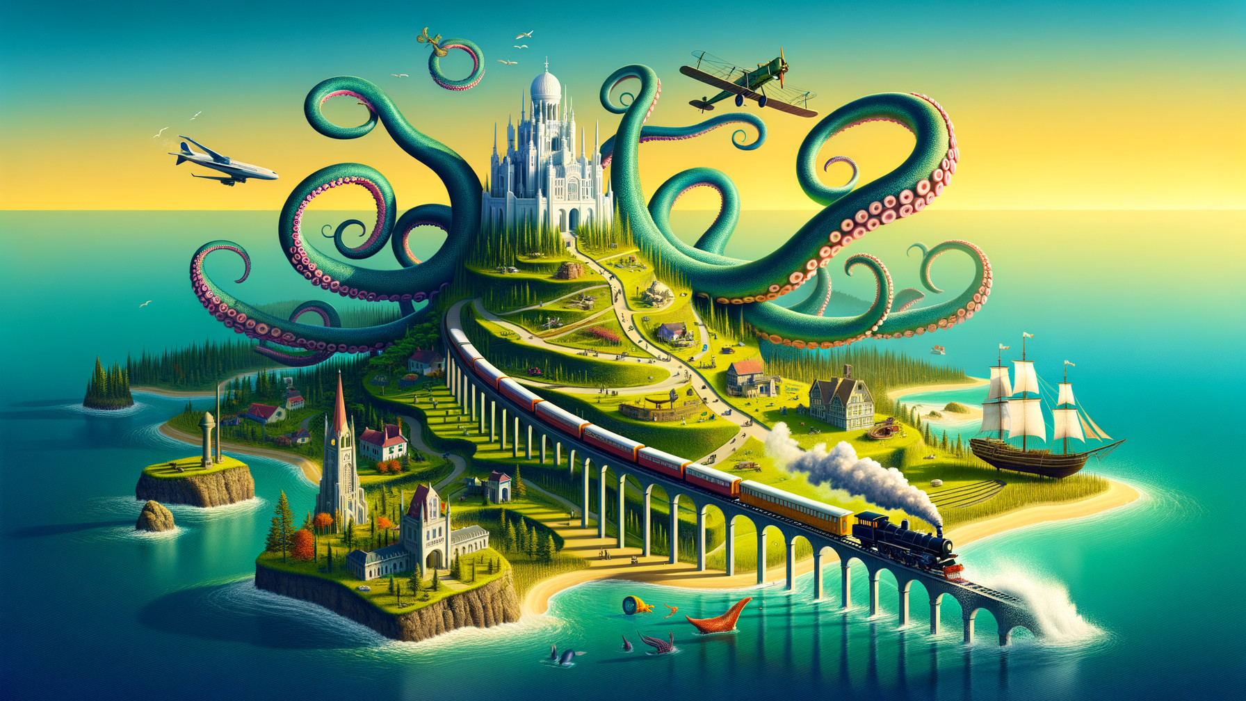 Prompt: ((A colorful panoramic masterpiece)), ((A surreal, whimsical landscape features an enormous octopus with its tentacles transformed into elevated landmasses. On the octopus's head, atop a grassy hill, a grand white castle sits, connected by winding roads and a small town nestled on the sloping hills. One tentacle arches across the sea, supporting a train track with a red train puffing smoke, another tentacle is a pathway. A classical sailing ship floats in the water near the tentacle, while a building in the foreground has a jet plane flying by it. A gigantic whale glides through the sea beneath the octopus's tentacles. Several buildings with green roofs and a blue pool surround the scene. Soft, warm lighting bathes the scene, creating a dreamlike atmosphere. The sky is a gradient of yellow and blue. The style is a blend of whimsical illustration and surrealism, evoking a sense of wonder and childlike imagination. The artwork resembles a children's storybook illustration with a touch of fantasy. Hyperrealistic style. Pastel and oil painting), By Joan Miró, Beksinski, Tomasz Setowski, Jacek Yerka, Amanda Clark, Aubrey Beardsley, Josephine Wall. Full Size, Full Length and Full Scale Image.