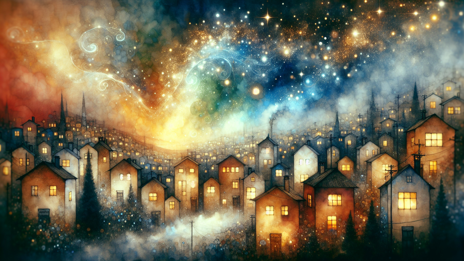 Prompt: Mesmerizing, dream hazy breezy style,Painterly watercolor-oil, watercolour painting, lighting chiaroscuro technique, magical impressionism, ethereal quality to the scene, Beautiful palette of pastels, A bright, vibrant city, rain, wet roads, a group of onlookers, shops with Christmas decorations, blurred bokeh, glow, cozy, melancholy, intense emotion, masterful blending of calming colors,vdepicting, hybrid style, soft bokeh, cozy melancholy, tactile realism, spring warm, muted desaturated colors, very soft colors, Visual poetry of melancholy and grace water color, fantastic view, thick palette knife technique reminiscent of Mona Edulesco, and Veneta Docheva, Georges De La Tour, Matisse, Pissaro, (Jean's prompt)