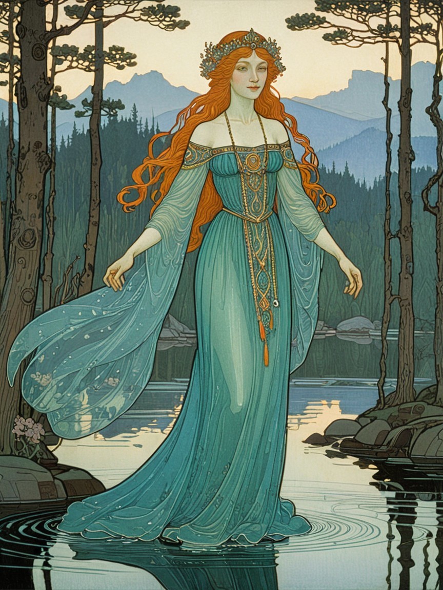 Prompt: Enchanting hoarfrost-covered trees, ethereal winter wonderland, reminiscent of Klimt and af Klint, mystical atmosphere, eerie and magical, sparkling and glittering effect, backlit by a low golden winter sun, predominantly white color palette, dreamy and pale ambiance, wide and vast landscape, lonesome and foggy setting, stunning lake with foggy reflections, snowflakes glistening in the air, hovering golden orbs, white deer with a white dressed beautiful woman amidst the trees, artistic style inspired by Klimt and af Klint, detailed and intricate, magical lighting effects, serene and mystical scene, Artstation.