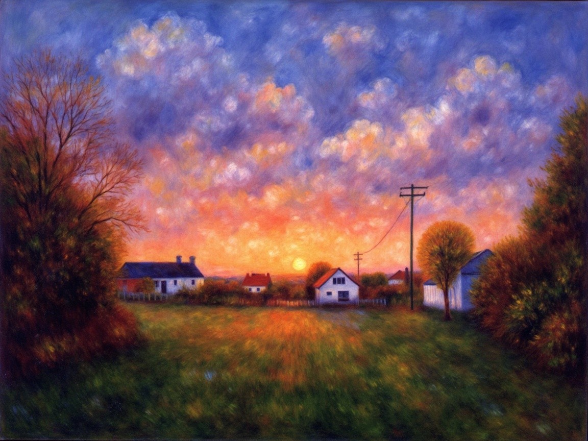 Prompt: An over-detailed matte painting in a splashy, textured art reminiscent of styles before 1912, portraying a vibrant, color-drenched scene. It shows a fisherman, engaged in his occupation by a reflective lake, under an array of red, purple and blue sakura trees. The surrounding hills are richly detailed and a blanket of scattered flowers adds to the setting. Golden petals are seen falling, creating a dream-like ambiance. The scene is lit up by a dark red sunset on the horizon, with the deep hues of the setting sun adding a dramatic lighting effect. dripping off the canvas