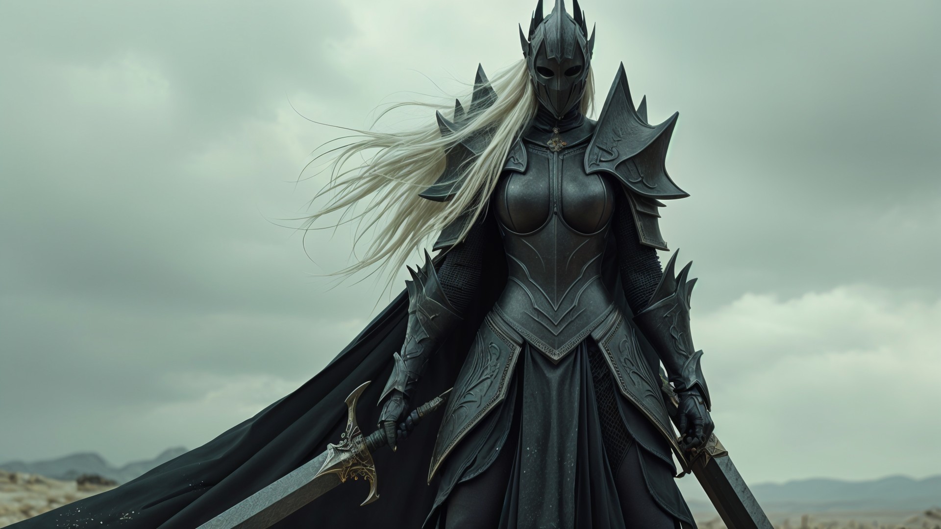 Prompt: A towering female warrior clad in ornate, blackened plate armor, wielding a large, two-handed greatsword. Her helm is a crested design with sharp, geometric protrusions, partially obscuring her face. Long, flowing white hair spills from beneath the helmet. The scene is a desolate, barren landscape under an overcast sky. Clothing includes a long, dark robe extends from beneath the armor, adding to a sense of imposing scale. The artistic style leans towards dark fantasy realism. The color palette is monochromatic, dominated by grays, blacks, and dull whites, creating a desaturated, cold atmosphere. The composition is a medium shot, emphasizing the character's height and dominance. The perspective is slightly low-angle, further enhancing the sense of power. Lighting is soft and diffused due to the overcast conditions, casting subtle shadows that accentuate the textures of the armor and landscape. Texture details are prominent, highlighting the intricate craftsmanship of the armor, the roughness of the sword, and the windswept quality of the hair. The mood is somber, bleak, and authoritative, creating an atmosphere of impending doom and formidable strength.