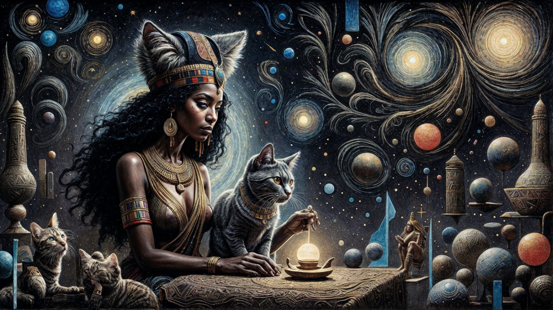 Prompt: Medium shot. Nubian Egyptian witch casts spells with a furry cat. Close up. Inspired by Paul Klee and Piet Mondrian. Glowing cosmic symbols in the sky. Vibrant colours and intricate details. Golden hour lighting with neon accents. Best quality, highly detailed, fine art, colourful, Boris Vallejo, Frank Frazetta, Robert Crumb, Hope Gangloff, Igor Tuveri. Ancient Egypt.