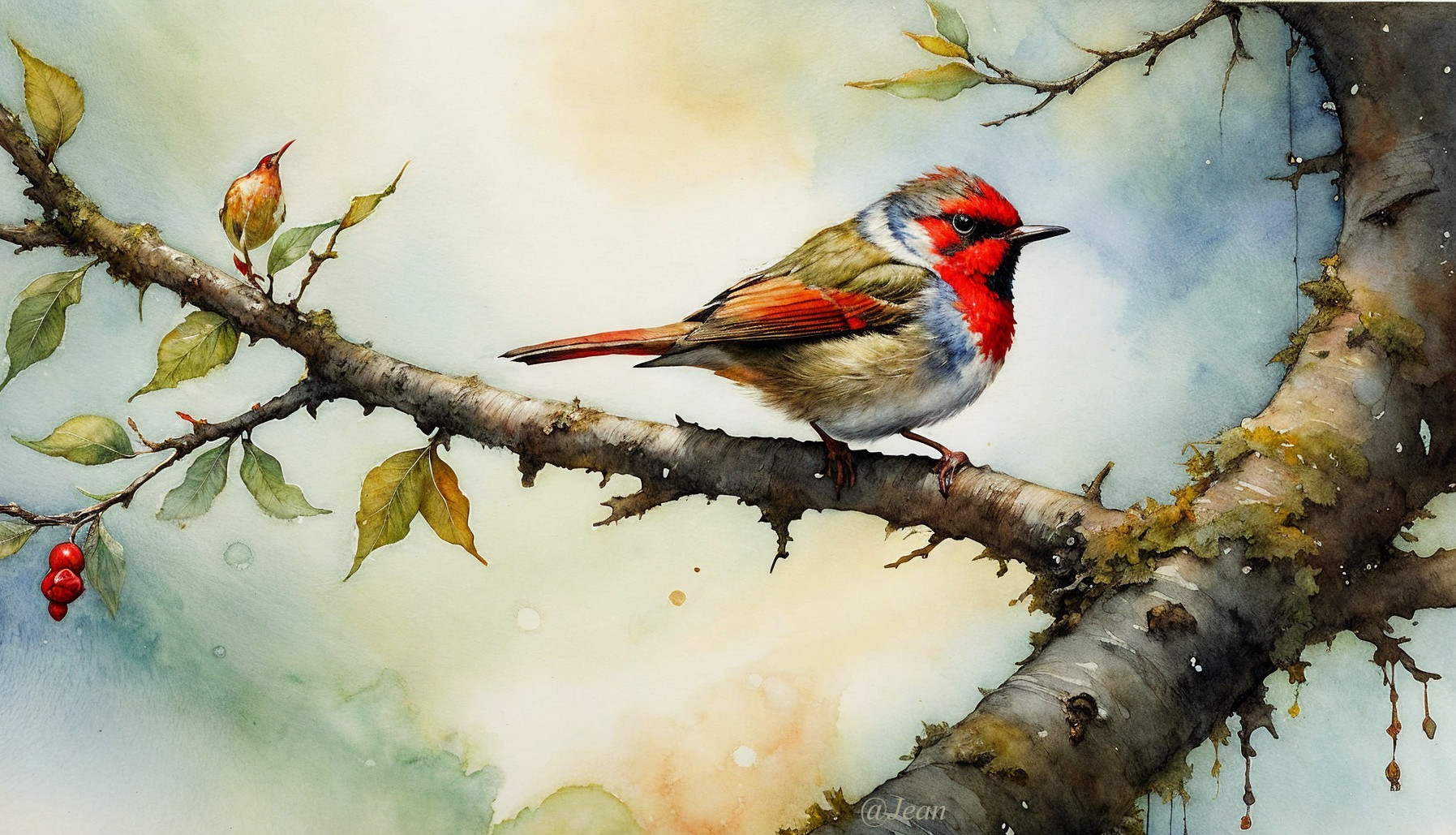 Prompt: The image is an intricate illustration that exudes a dreamlike and surreal atmosphere. At the center of the composition is a person with wild, red hair, dressed in a long gray robe or coat. The individual appears to be interacting with two fantastical orange creatures resembling cats but with dragon-like features. These creatures have spiky, fiery fur and wings that suggest motion, as if they are about to take flight. One of the creatures is perched on a table covered with a red tablecloth, while the other seems to be levitating above it.