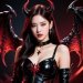 At the far end stands a lone woman, fierce, lean, and unnervingly real. Her tattered garments, splattered in crimson, molten gold, and deep plum, ripple and flutter as if alive. Her eyes burn gold and electric cyan, piercing, feral, and seductive, drawing the viewer into her charged presence. Every curve, angle, and motion radiates erotic danger and magnetic power.