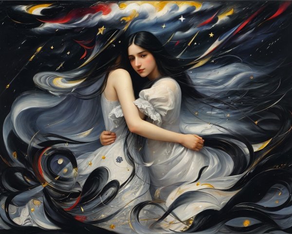 Prompt: A silhouette of a solitary long haired woman sitting on a dock at sunset, gazing across a tranquil body of water. The scene is painted with soft pink and purple hues, creating a peaceful and introspective atmosphere. Surrounding her are splashes of color that evoke a sense of dreamy abstraction, while the calm water reflects the serene colors of the sky. The background features faint outlines of distant trees or hills, enhancing the sense of solitude and connection with nature. The atmosphere is contemplative and serene, inviting viewers to reflect on their own thoughts. Inspired by the poetry of fleeting love and the visual style of Catrin Welz-Stein, Makoto Shinkai, and Tran Nguyen. Dreamy hazy breezy watercolour, wet-on-wet technique, visual poetry, minimalist impressionism, melancholic beauty, soft rainlight, floating textures, no text or symbols.