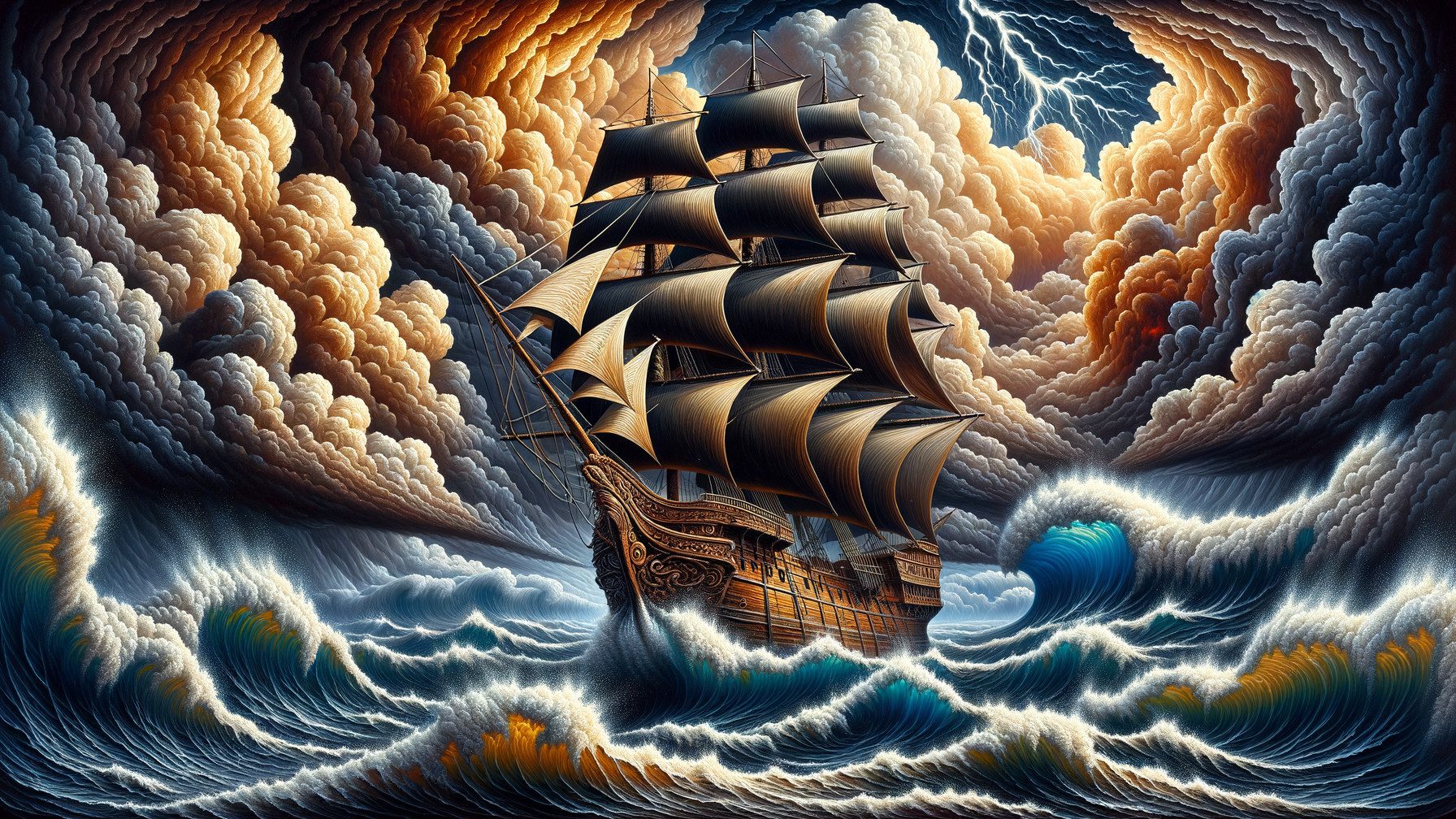 Prompt: A majestic tall ship sailing through a tumultuous sea. The ship, with its dark, billowing sails, is captured in a dynamic pose as it navigates towering waves, creating splashes of white foam. The ship's wooden hull, detailed with ornate carvings, reflects a rich, warm brown tone. Above, ominous clouds swirl in shades of gray and black, crackling with bright bolts of lightning that illuminate the scene dramatically. The background features a stormy sky, emphasizing the intensity of the moment, while the surface of the ocean shimmers, displaying deep blues and blacks against the contrasting white of the cresting waves. The overall composition conveys a sense of adventure, power, and the raw forces of nature.