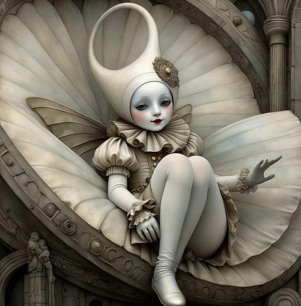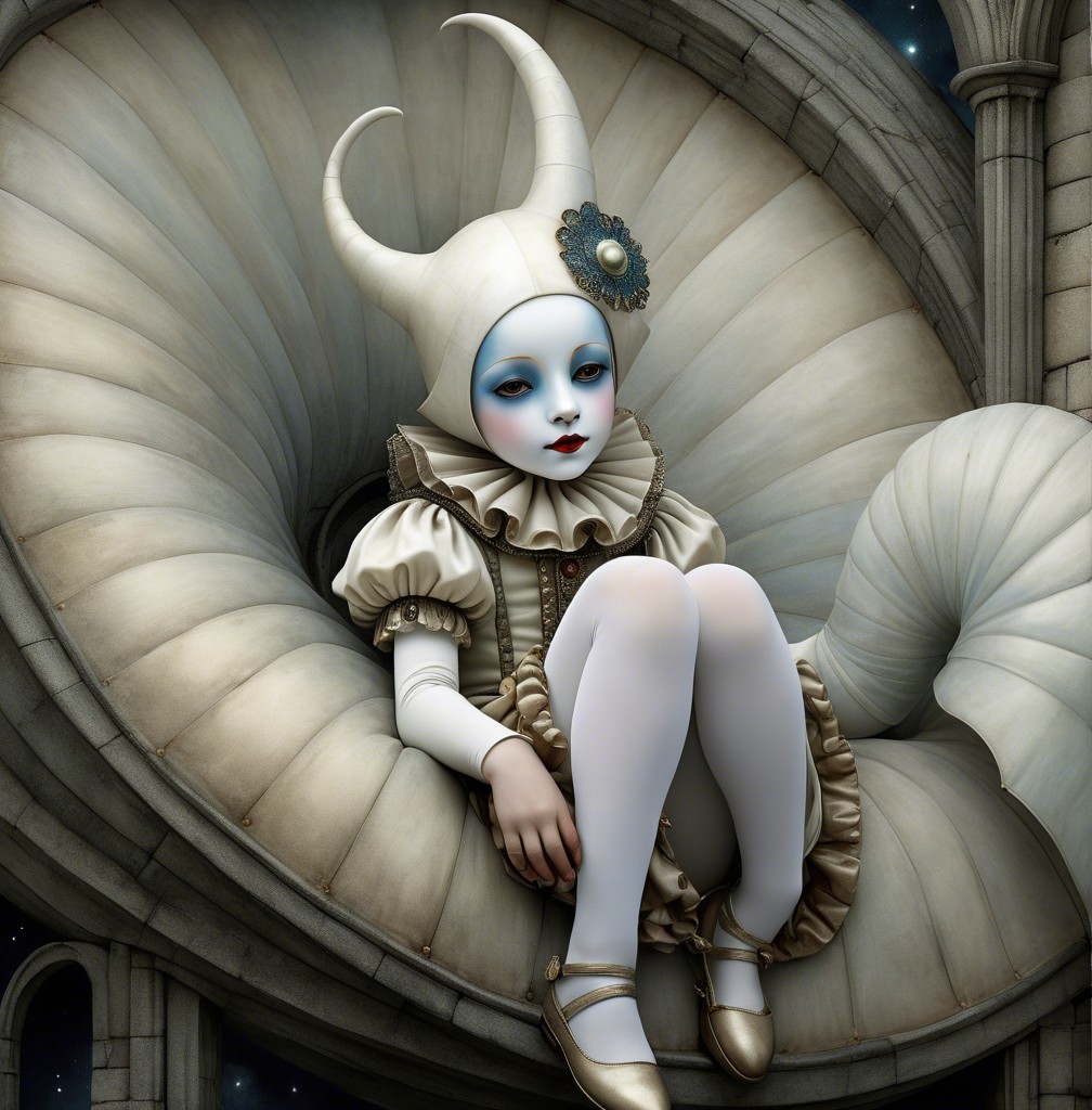 Close up, adorable Pierrot creature in the celestial maze, in the style of Alexander Jansson. by Catrin Welz-Stein, Michael Parkes