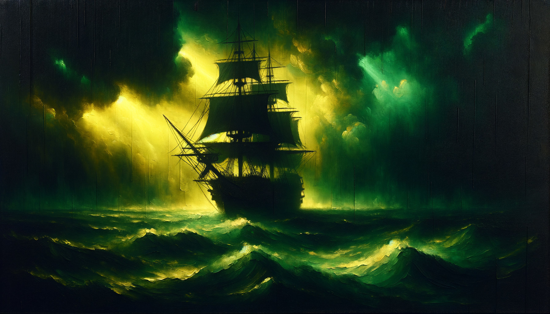 ship sailing on the sea, green and yellow color palette, painting, brush strokes, epic fantasy art style, oil paint, heavy texture, green sea, black sky, green and yellow lighting, ship is far away from viewer, green and yellow color scheme, ship is in center of composition, ship only visible from front view, dark shadows around it, pirate vibes, pirate atmosphere, pirate aesthetic, pirate vibe, ship seen from distance, ship centered in frame