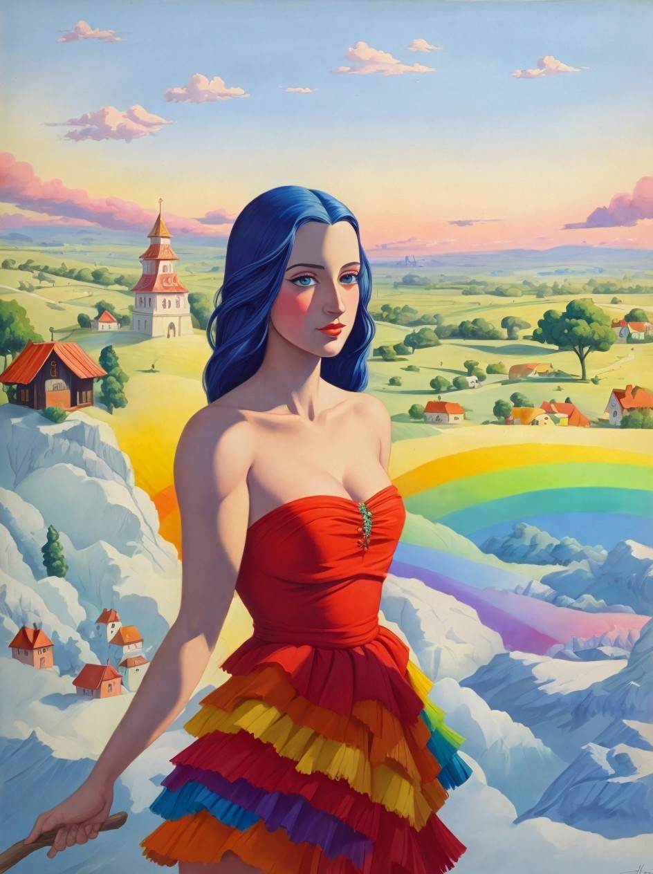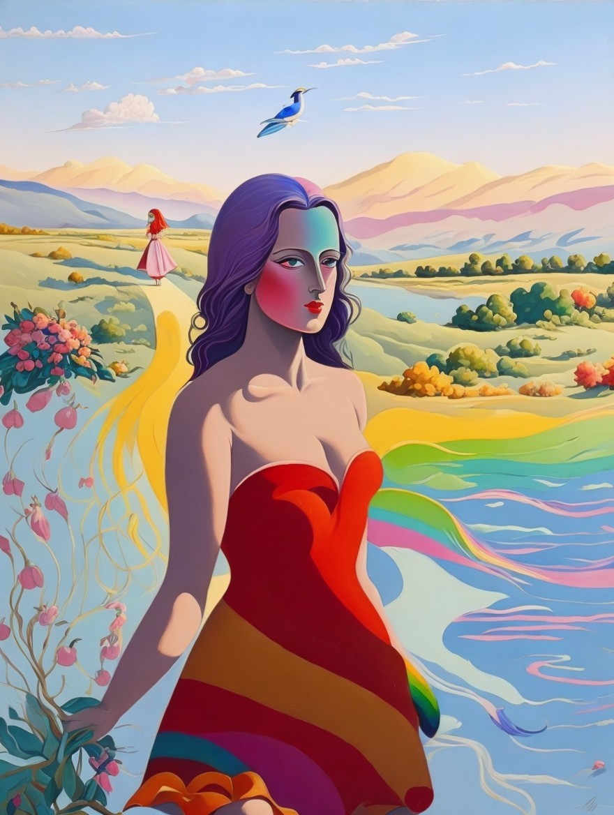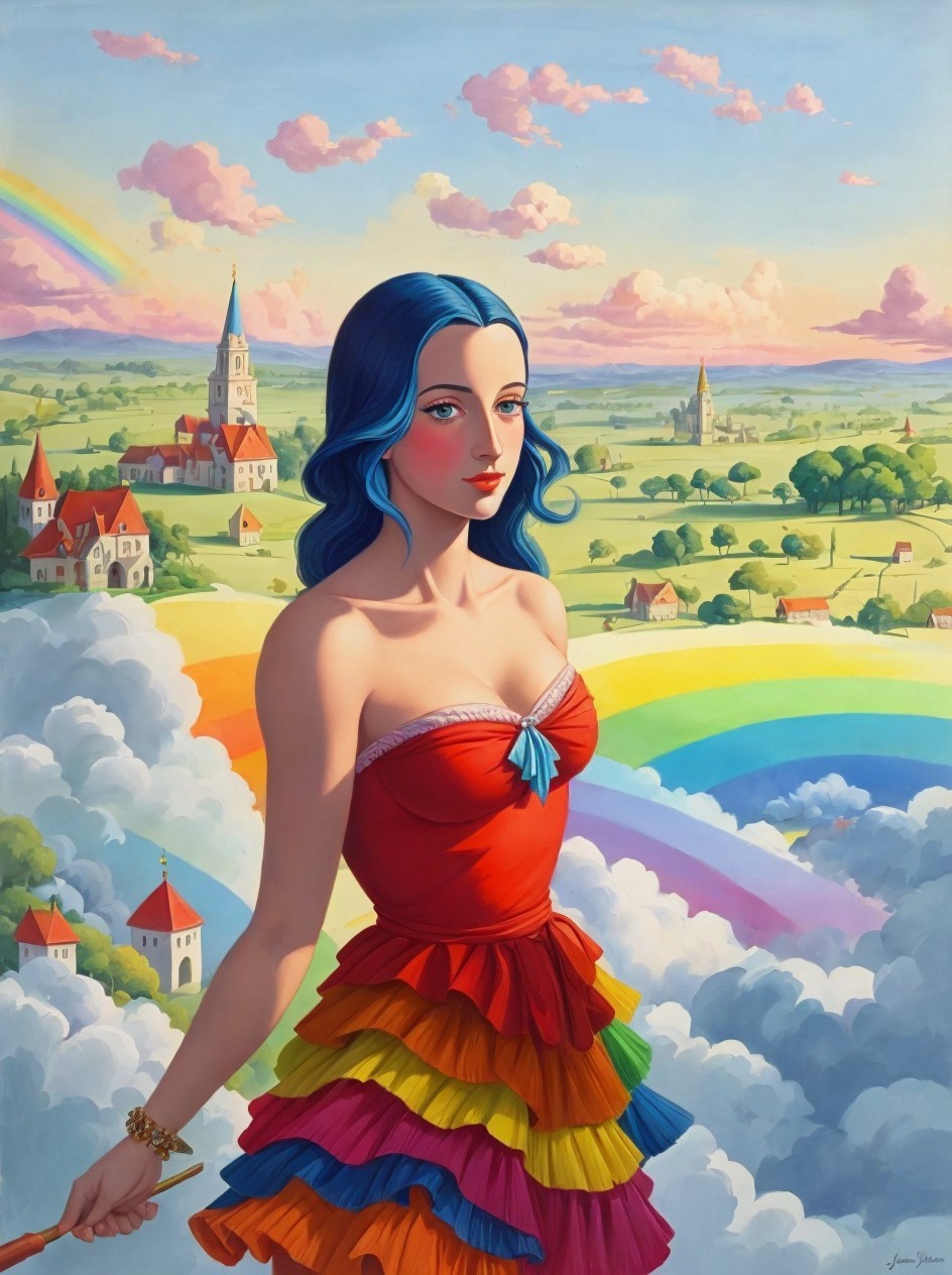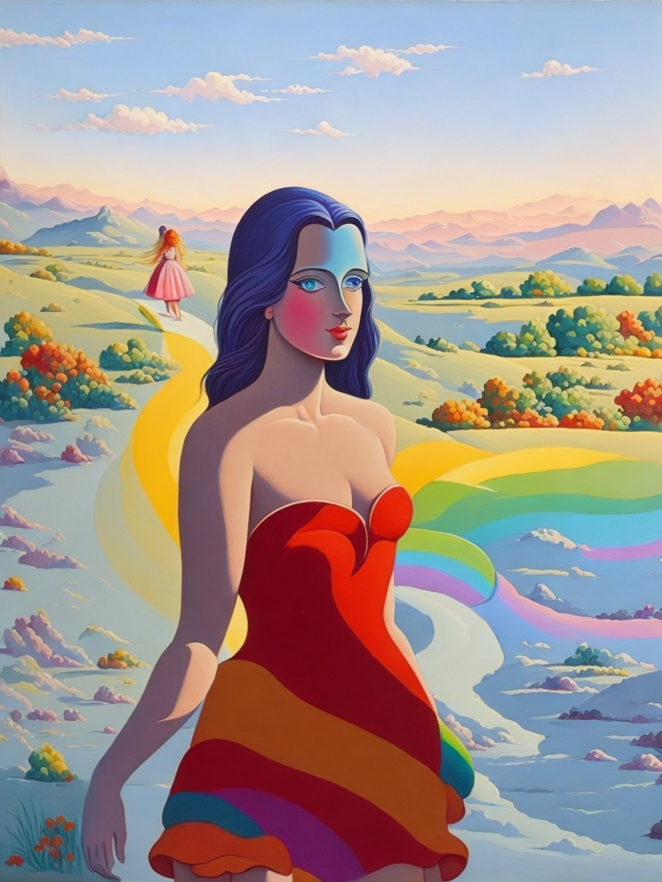 Vibrant painting of woman with blue hair and double rainbow landscape