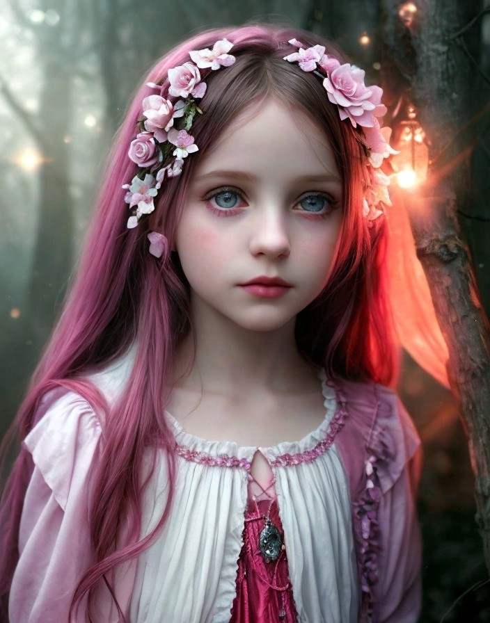 A young girl with long, pink hair adorned with flowers gazes softly. She wears a delicate dress with lace detailing, surrounded by a magical, ethereal forest atmosphere illuminated by gentle light.