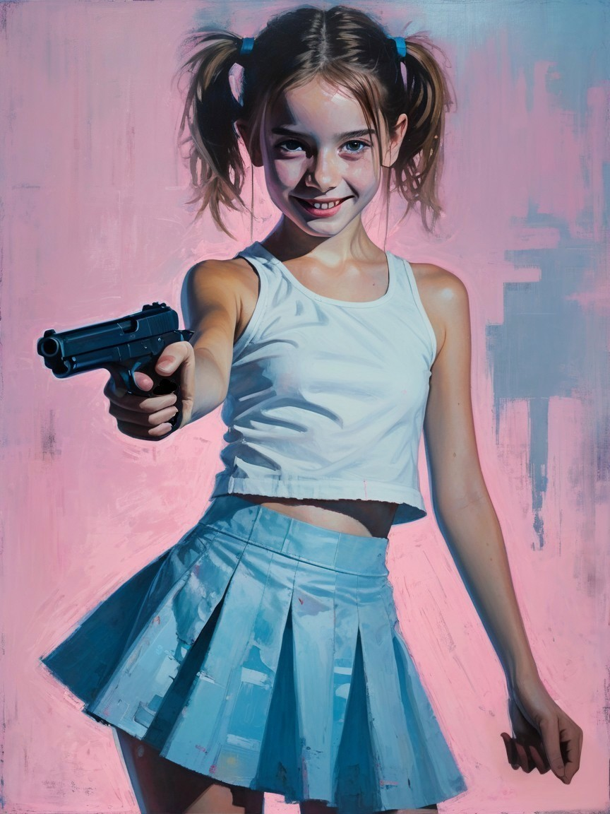 Prompt: portrait, girl with mischievous, sly smile pointing a gun at the viewer, pink skirt and white tank top, dark, abstract, ominous, light blue background, style of Dave McKean, Christopher Bucklow, Stephen Gammell and Jeremy Mann