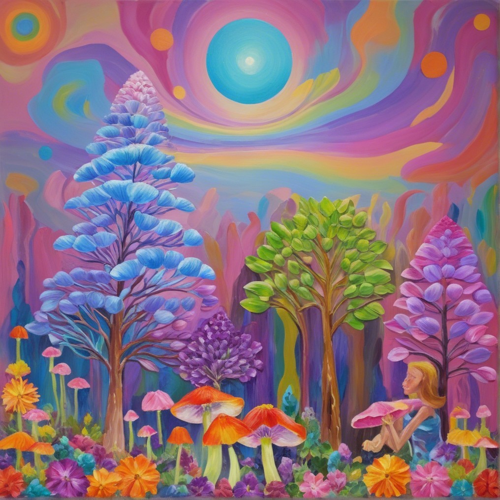 A vibrant, surreal landscape features stylized trees in shades of blue, green, and purple, surrounded by colorful flowers and mushrooms under a radiant, swirling sky.