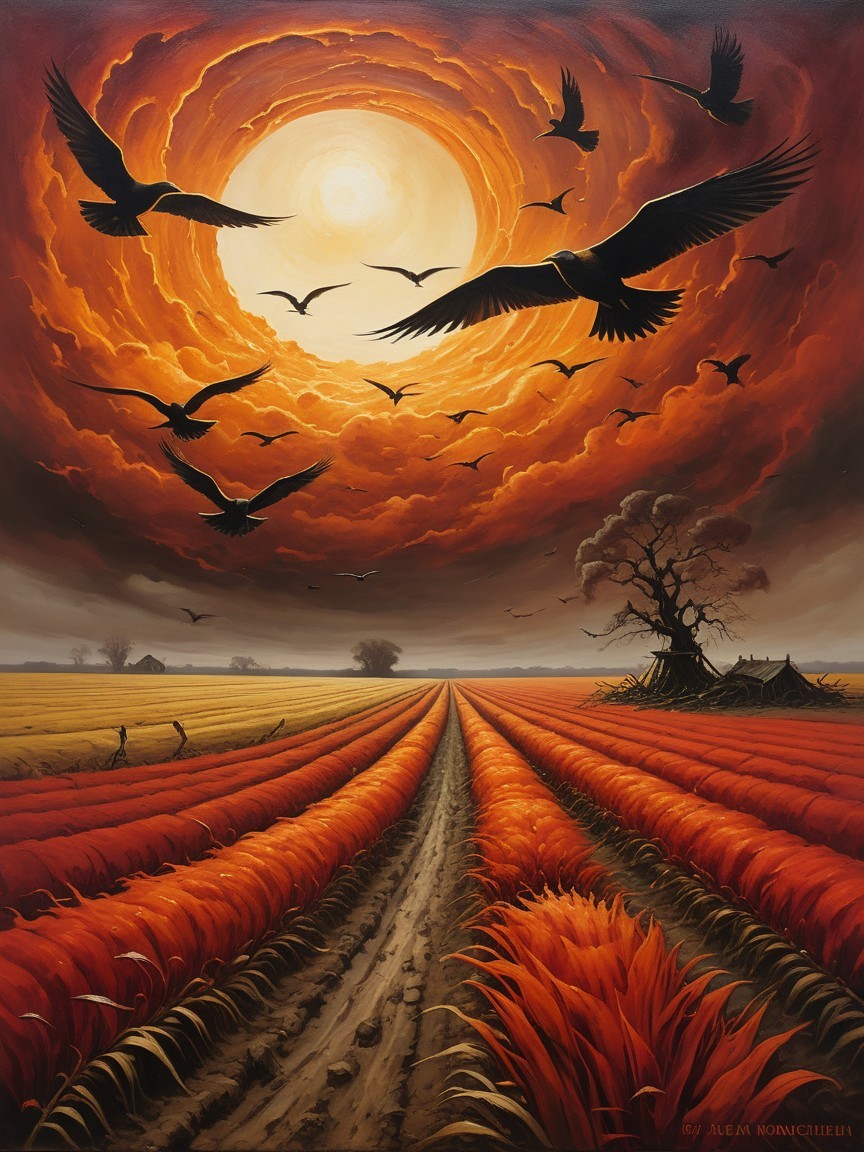 Prompt: Fiery whirlwind of birds over ruined crops.
