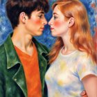 Two cartoonish LEGO figures stand facing each other, smiling. The boy has curly brown hair and a green jacket, while the girl has long brown hair and wears a floral sweater. Colorful building blocks are in the background.