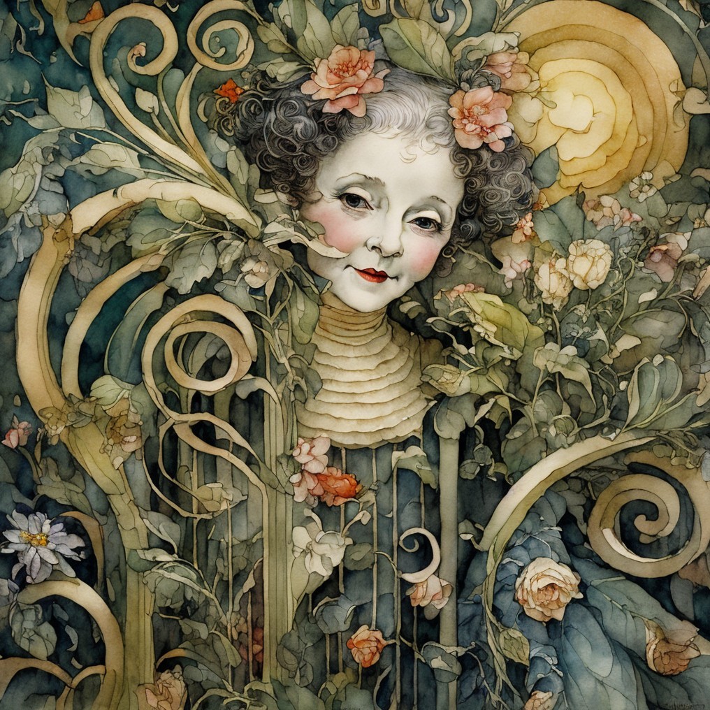 A whimsical elderly woman with a joyful smile holds a harp, surrounded by vibrant flowers and intricate foliage, exuding warmth and charm in a beautifully detailed illustration.