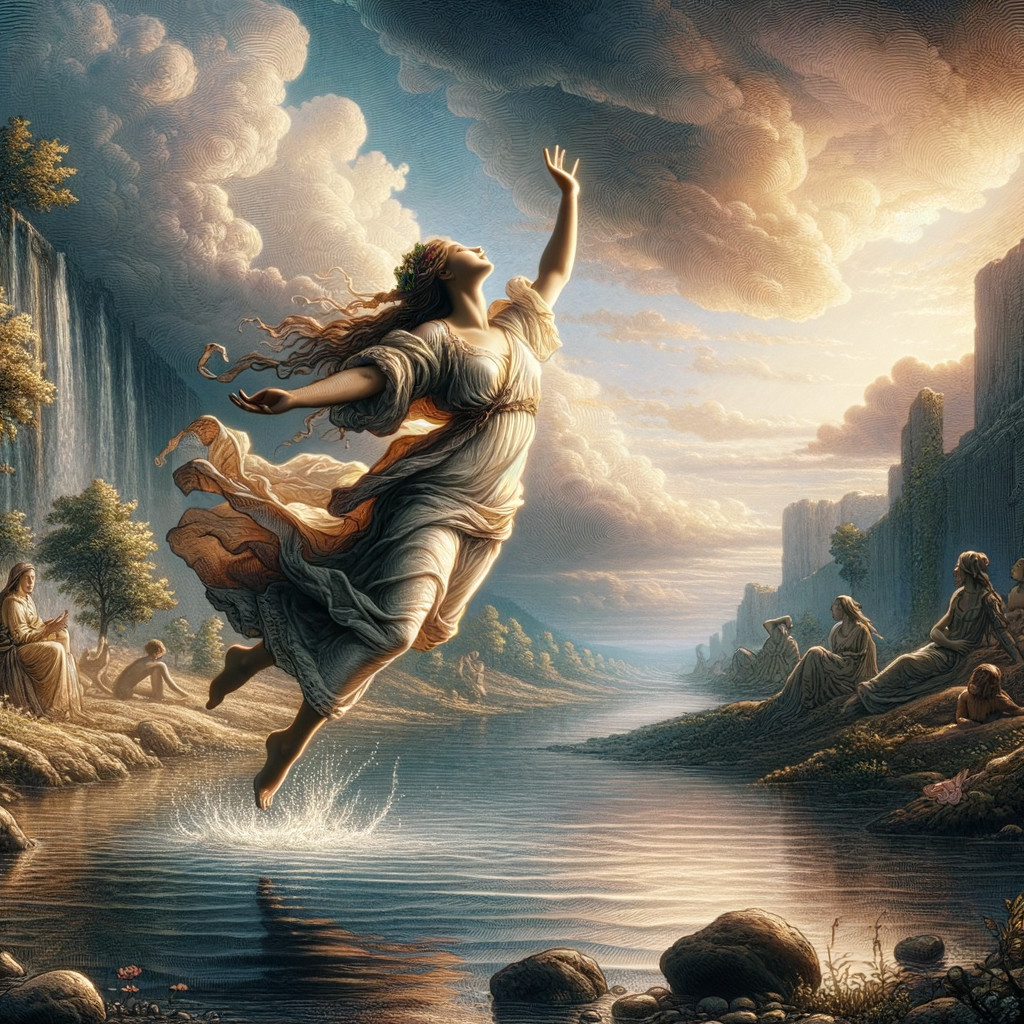 Ethereal woman in flowing robes ascends among awe-struck people in picturesque landscape
