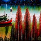 The image features vibrant red and green trees beside a serene lake, with two colorful boats anchored. The landscape is rich in color, evoking a peaceful, natural setting.