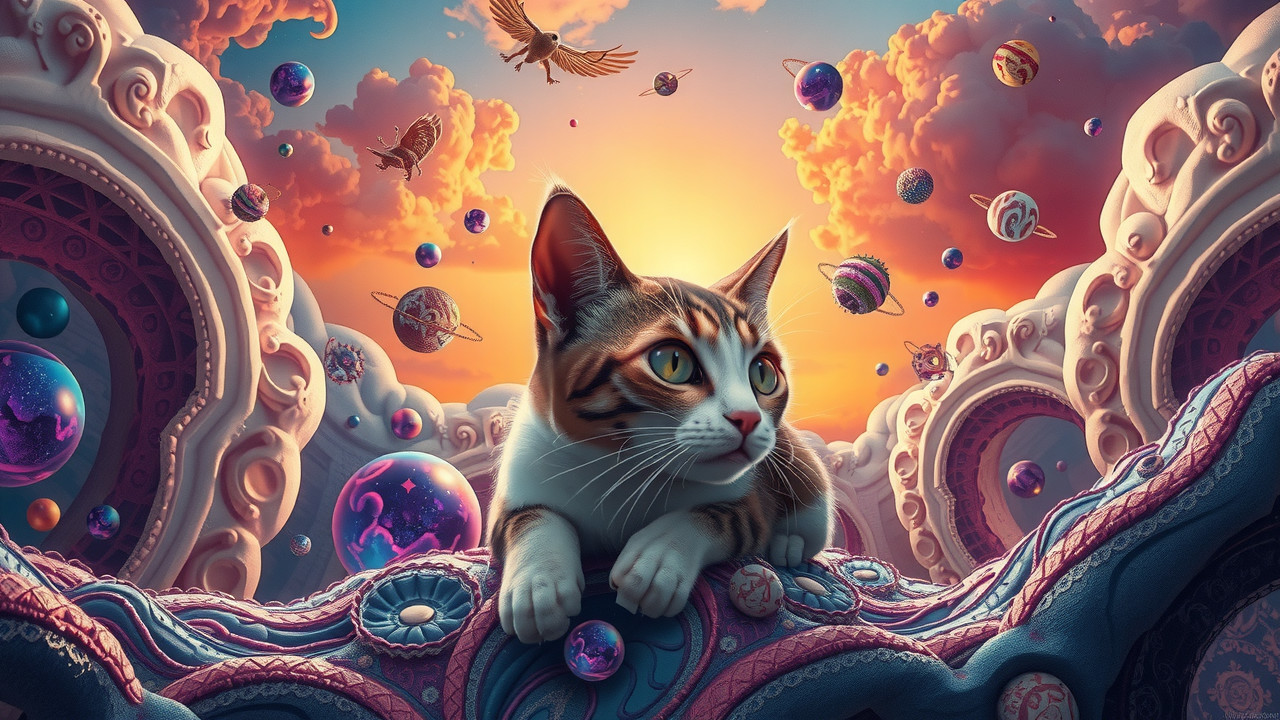 A calico cat lounges on a fantastical, colorful landscape with swirling clouds and vibrant planets. Butterflies flutter around, illuminated by a glowing sunset in the background.