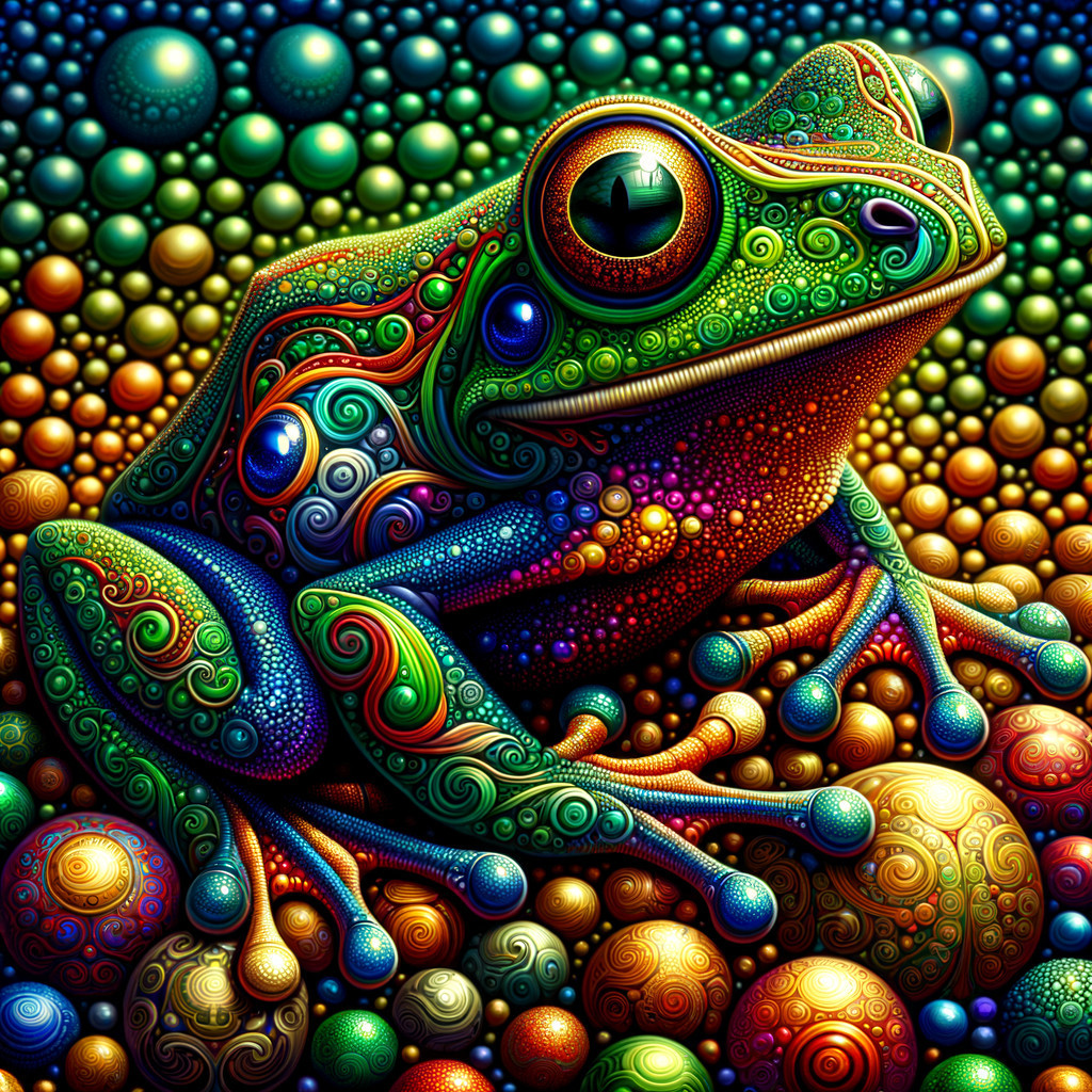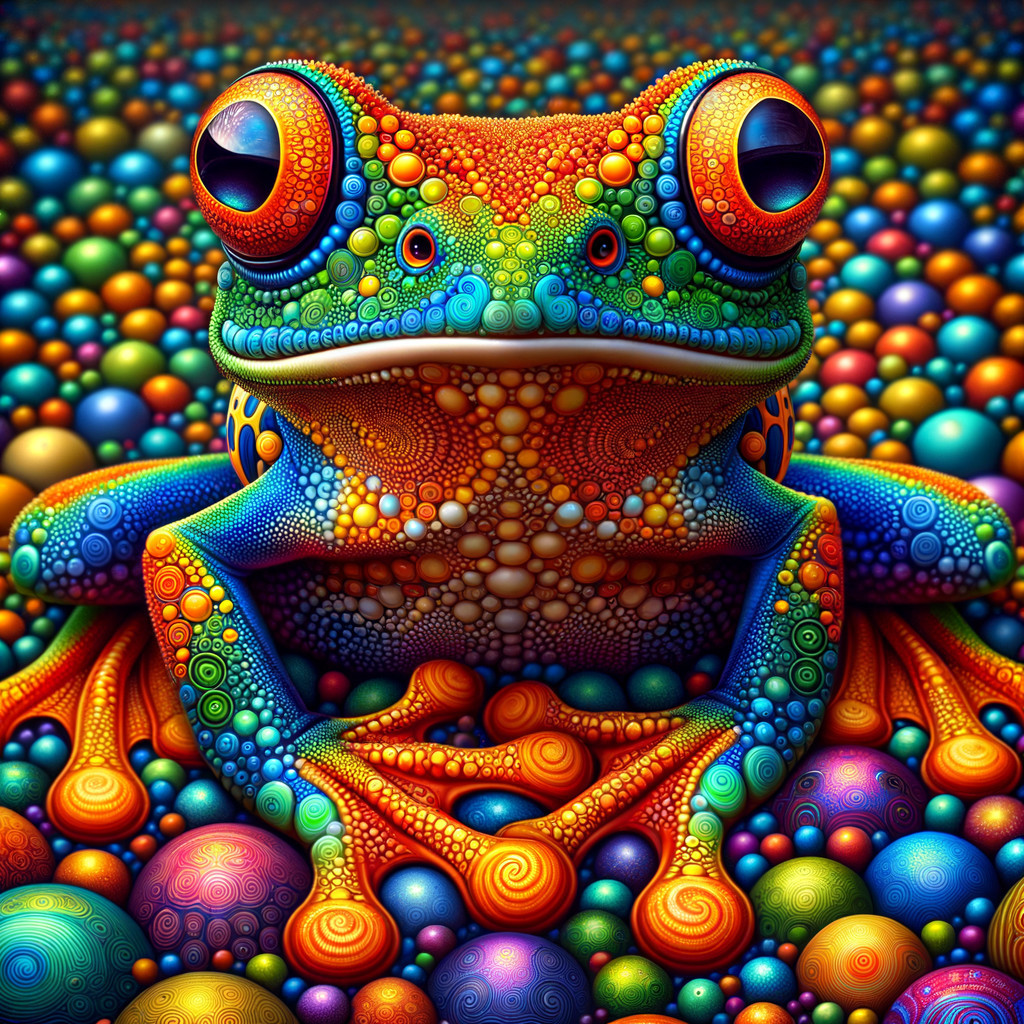 A vibrant, psychedelic illustration of a frog with complex patterns and a kaleidoscope of colors against a dotted background.
