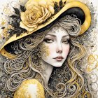 A serene young woman with flowing hair adorned with a vibrant floral hat. She gazes softly amidst a backdrop of blooming flowers, radiating tranquility and nature's beauty.