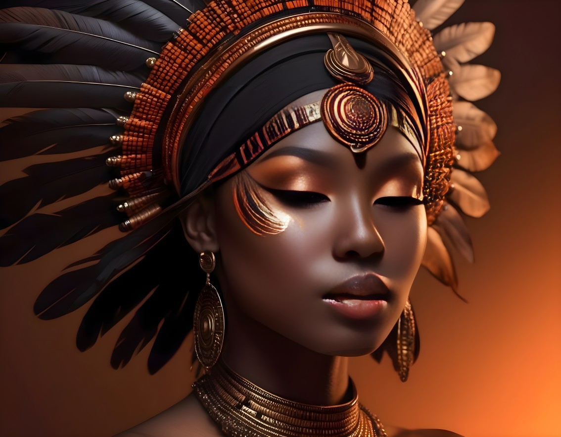 A woman with dramatic makeup and a feathered headdress exudes a strong, serene presence, with warm tones enhancing her beauty.