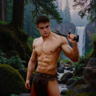 A muscular warrior stands confidently with a sword, accompanied by a sleek black panther, in a lush forest setting with a waterfall, evoking a sense of strength and adventure.