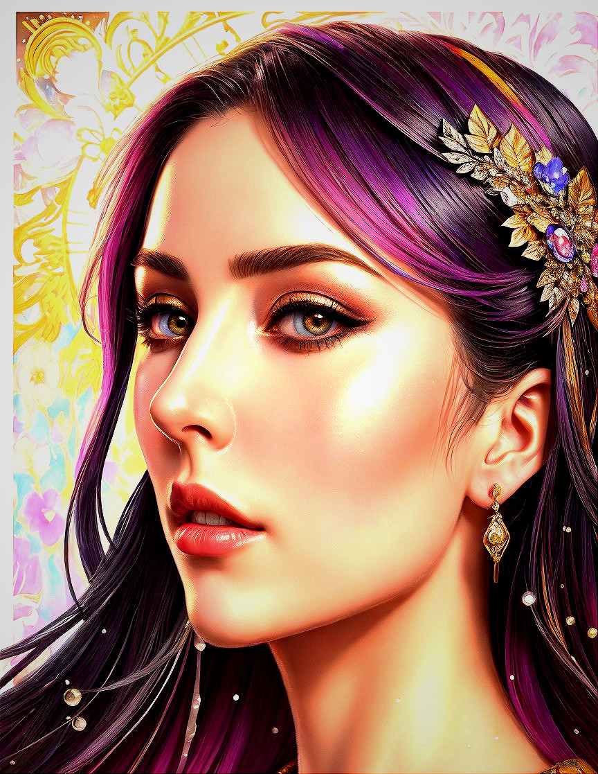 Pop art Portraiture, stylized watercolor details, fauvism, intricate ornamental beauty, encaustic strokes, light flares, finest strokes in clothing, metallic textures, Fantasy depiction, brightness 1.9, Streamline_Moderne,stylized illustration 1.5, lineage illustration, dynamic lighting 1.7,
