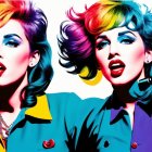 Two animated girls stand together in a sunny field of flowers, smiling brightly. One has long brown hair and the other has light purple hair, both wearing colorful outfits adorned with floral patterns.