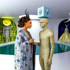 Surreal Scene with Woman, Mummy, and Starry Sky