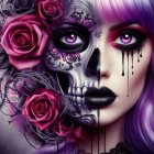 A striking close-up of a woman with vibrant purple makeup and bold eye designs, framed by roses. Her blue eyes pop against the colorful background, enhanced by droplets of water.