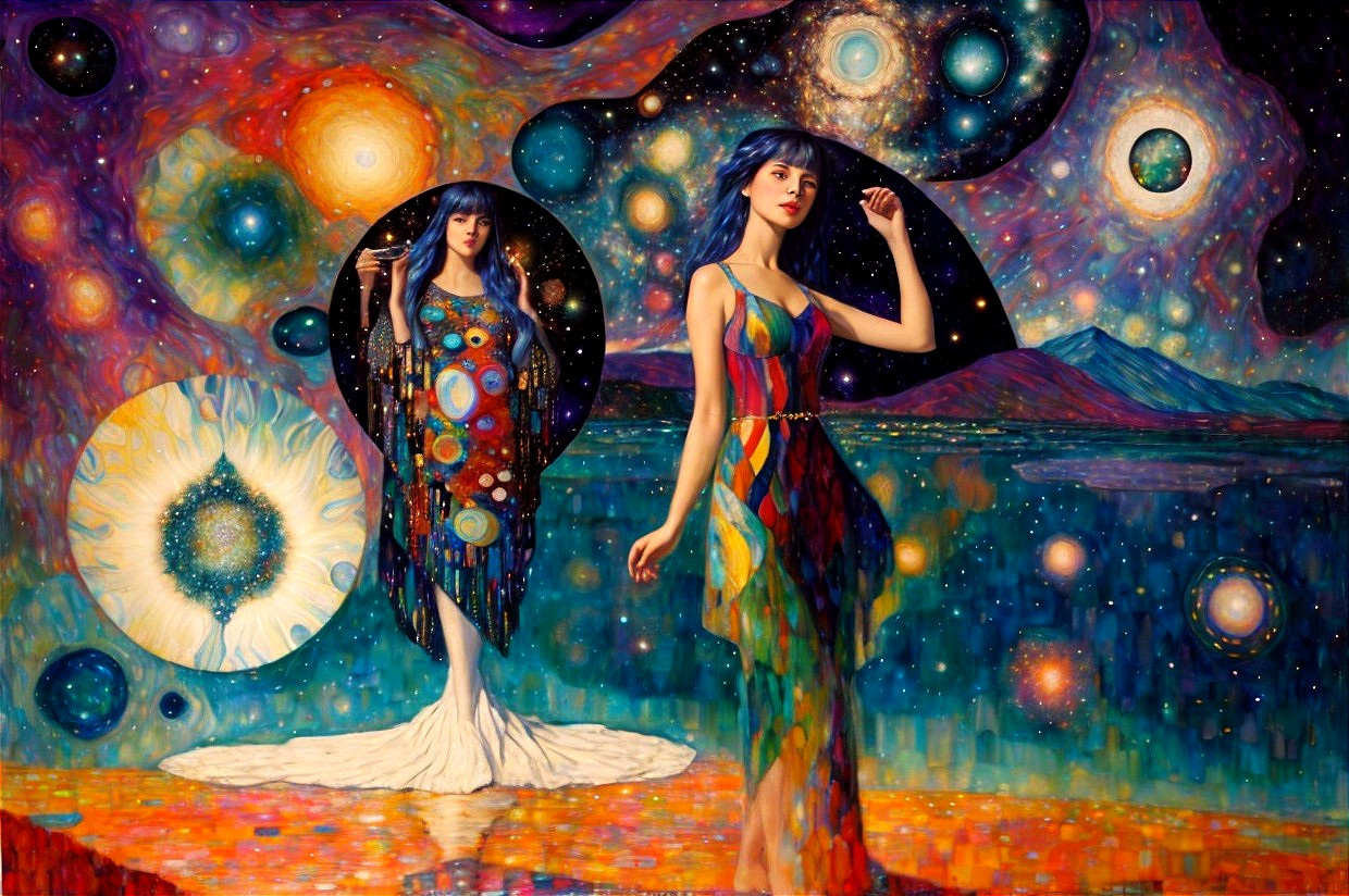 detailed mixed media artwork, Woman in white dress of beauty standing by a lake, nightscape, cosmic sky, blue hair of water. Mountains. Oil painting by Bill Sienkiewicz, Willaim Blake and Gustav Klimt. small cosmic astronomy photo details of galaxies and star clusters