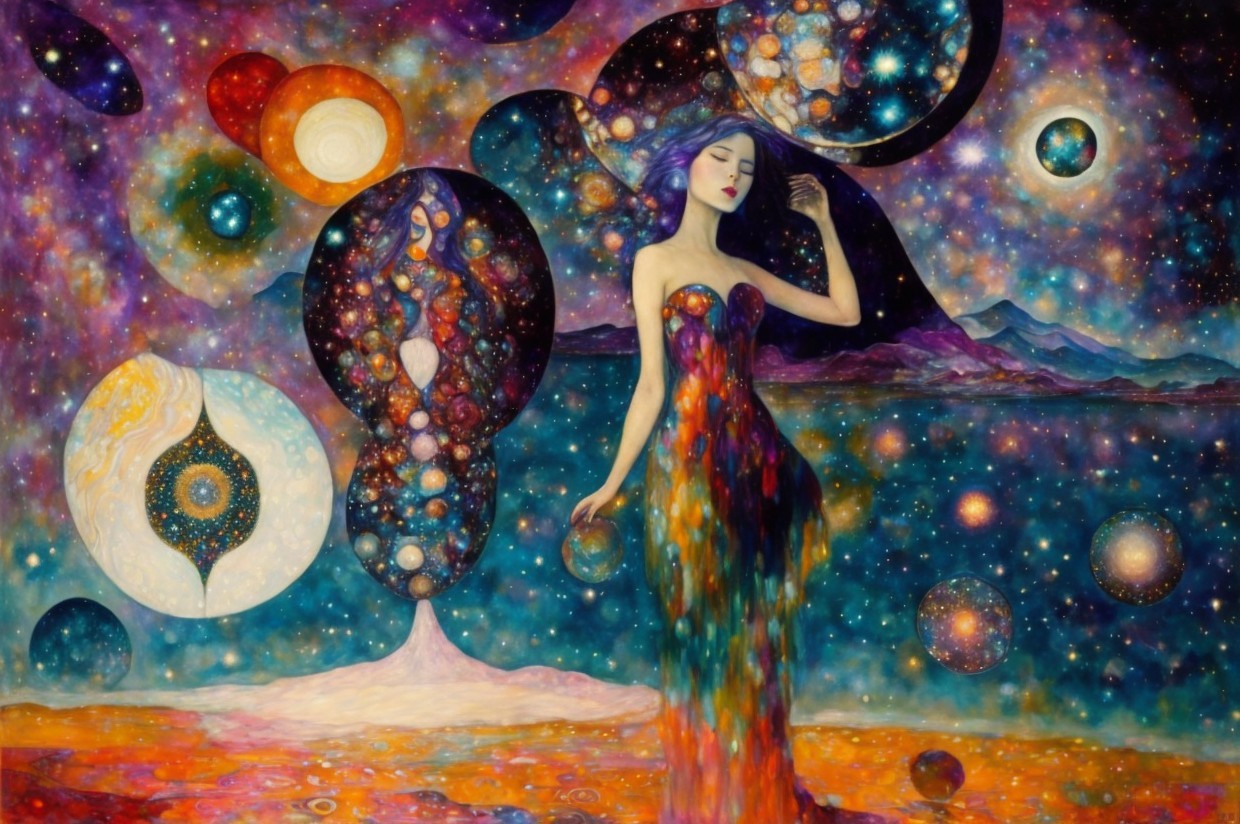 + Prompt:detailed mixed media artwork, Woman in white dress of beauty standing by a lake, nightscape, cosmic sky, blue hair of water. Mountains. Oil painting by Bill Sienkiewicz, Willaim Blake and Gustav Klimt. small cosmic astronomy photo details of galaxies and star clusters