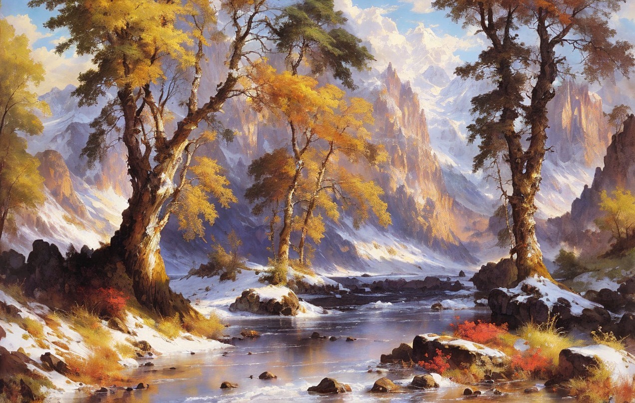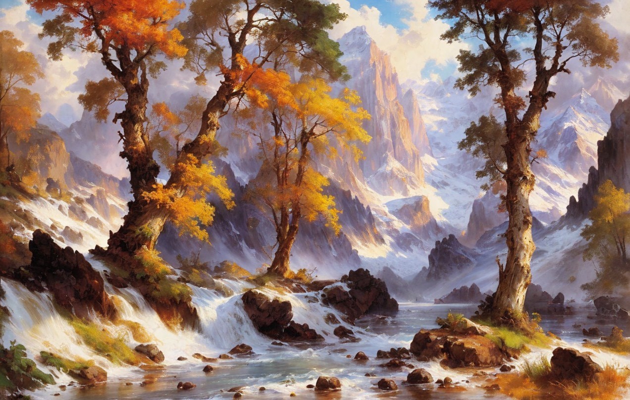 Scenic autumn landscape with waterfalls, rivers, orange foliage, and rocky mountains.