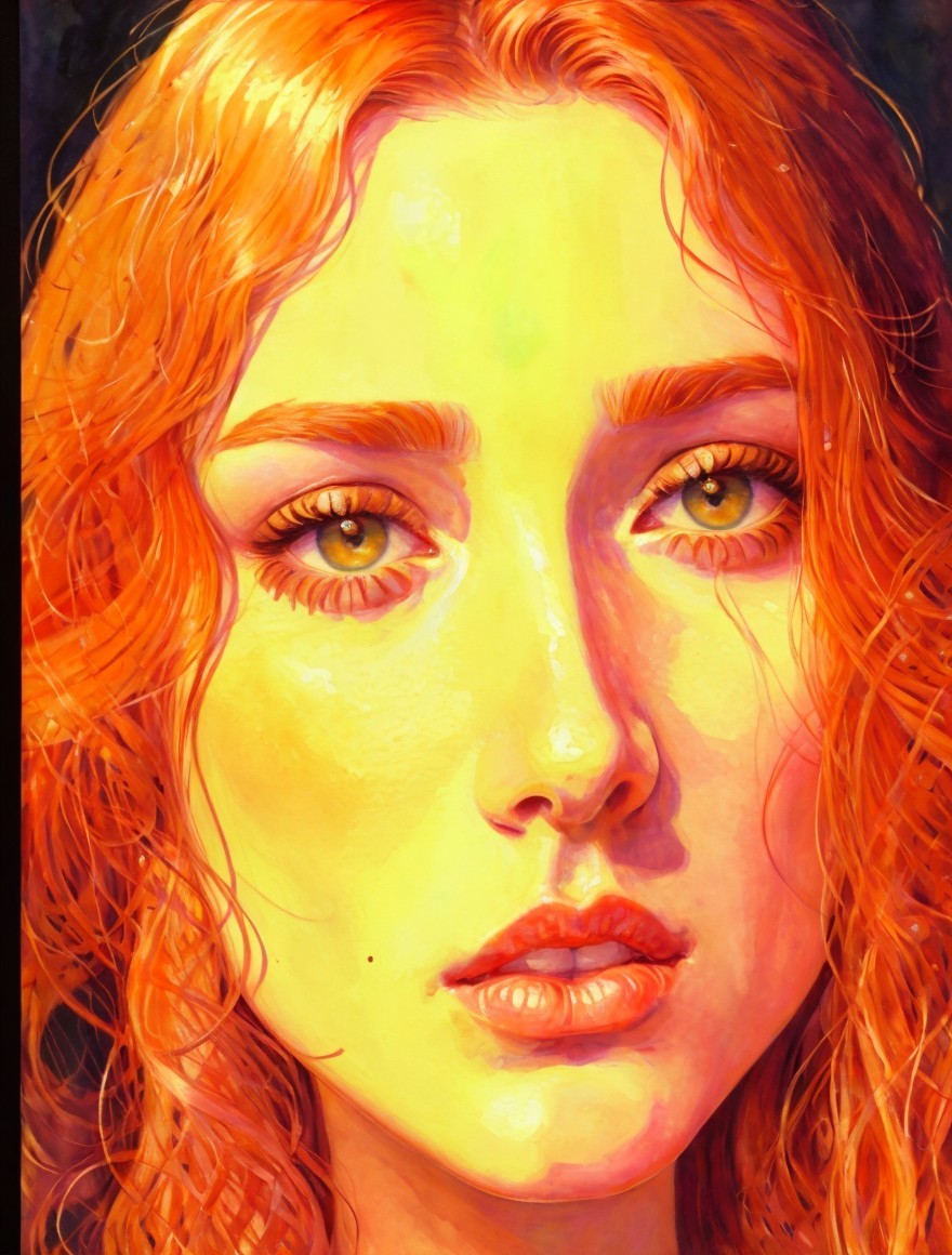 A portrait of a woman with curly red hair, striking yellow eyes, and a warm, golden skin tone illuminated as if by sunlight.