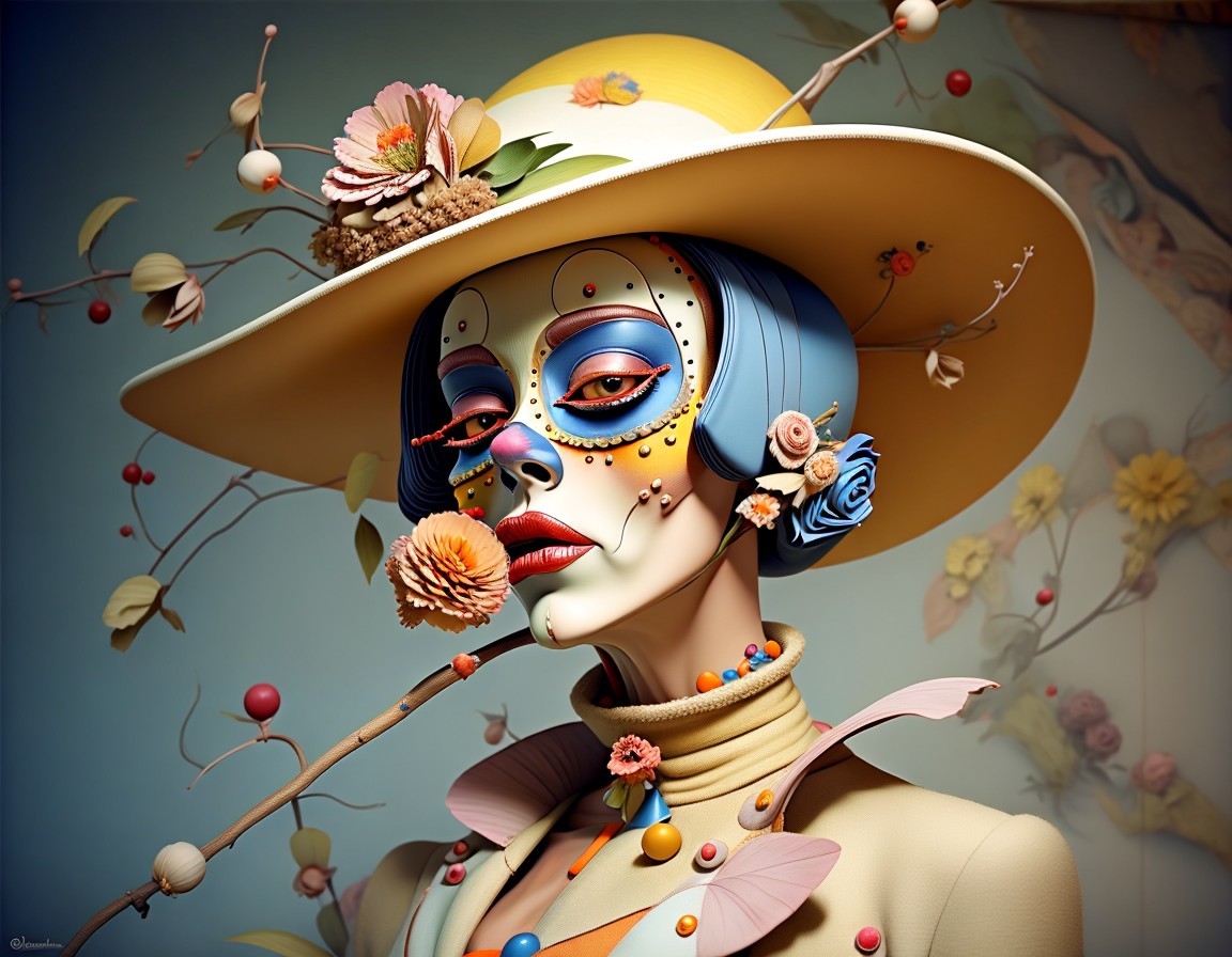 Portrait of a woman with blue curls and bold makeup