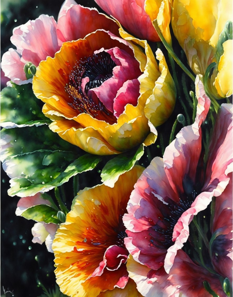 Bouquet of poppy flowers, watercolor, wet on wet, splash effect, splash, Steve Hanks